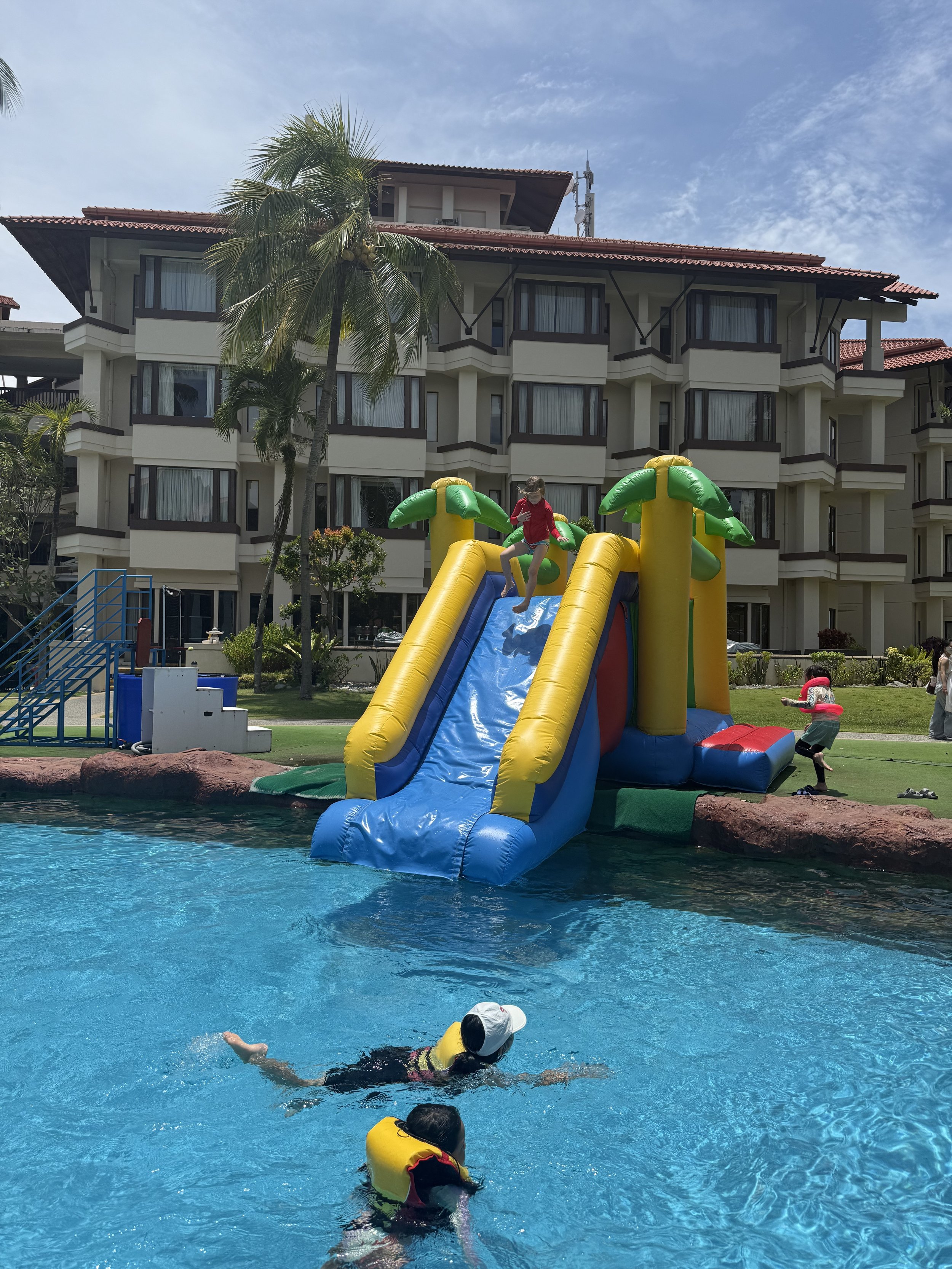 We did a little swimming in the pool before the inflatable slide came to life for one of it’s four daily two hour cycles of operation. The resorts clientele seems to be mostly Korean families, the breakfast options are equally split between Western and Korean. Most of the Korean families have no interest in the sun touching any part of their skin so the pool outfits have been very different from Europe.
