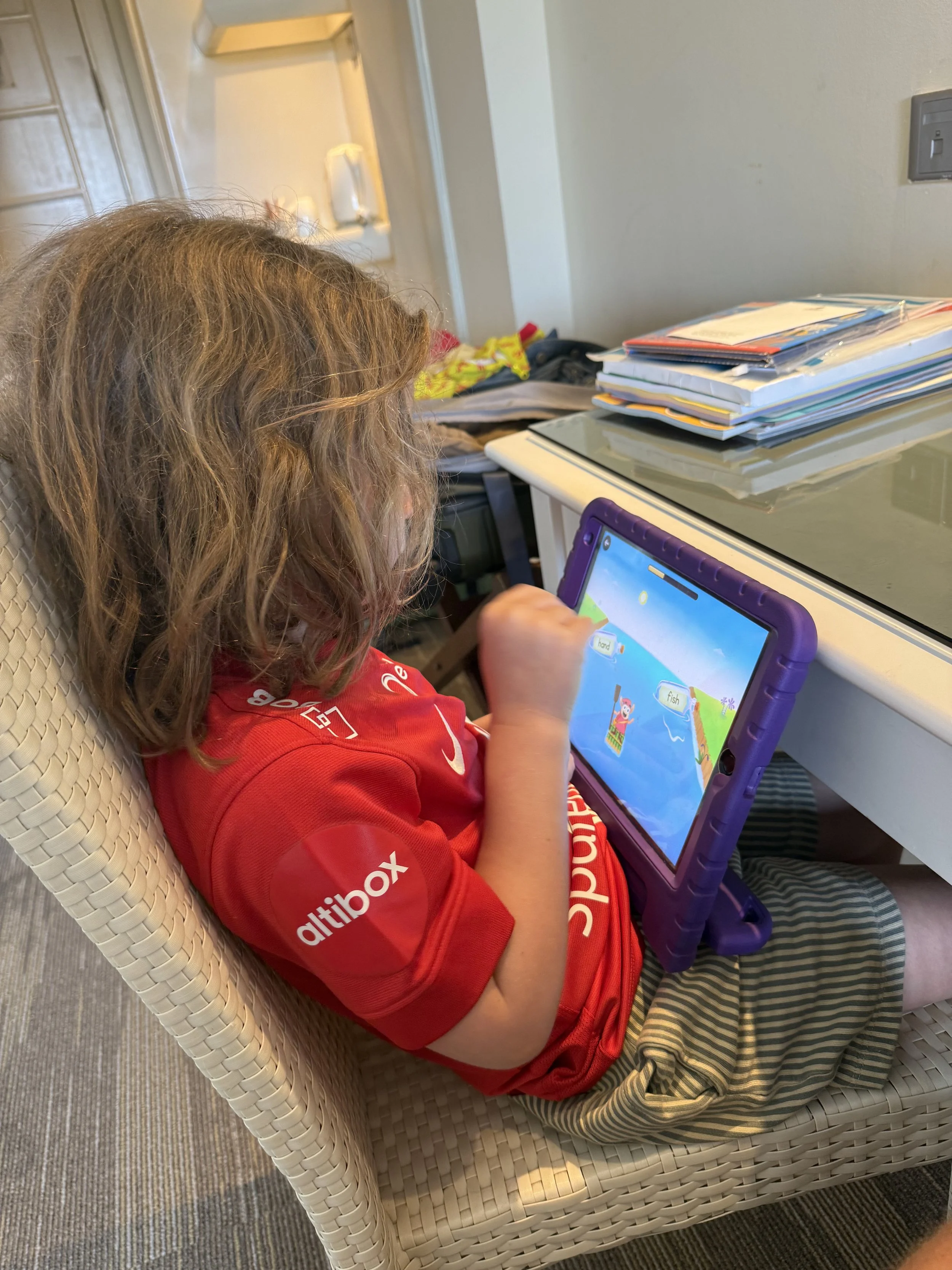 Even with the weather prediction as rain for our whole time here it was mostly a sunny day today. Happy to not be on another excursion that required time in a car we got back to our “normal” routine. I headed to the gym in the morning and then we all went to breakfast together before heading back to the room for home school. The two rooms definitely help the kids focus better by keeping them separated. Ollie wrote a letter to his friend from home Harper, confirming he had seen, and had fun with, her mom and dad, Wendy & Nolan, in Hong Kong.