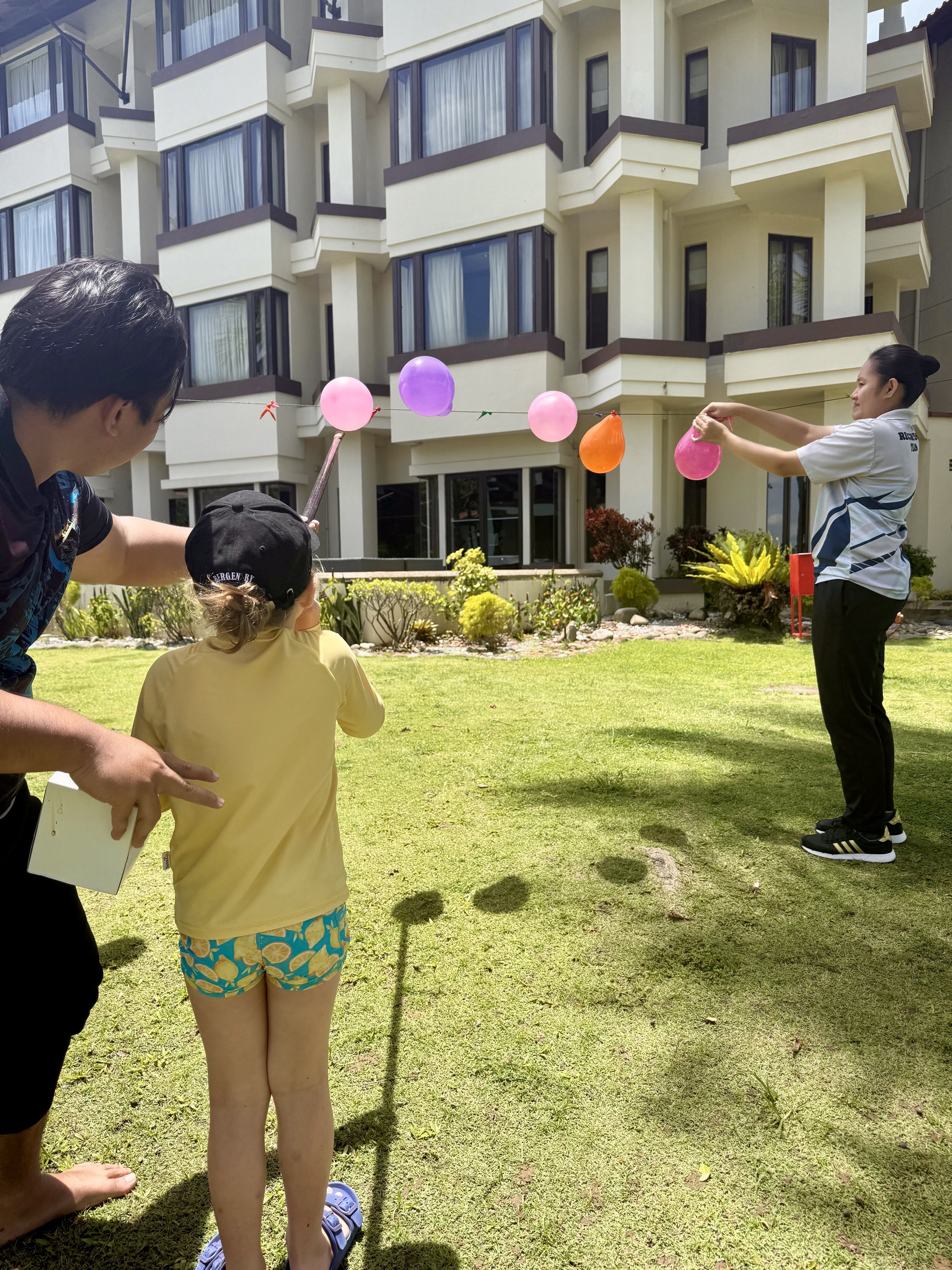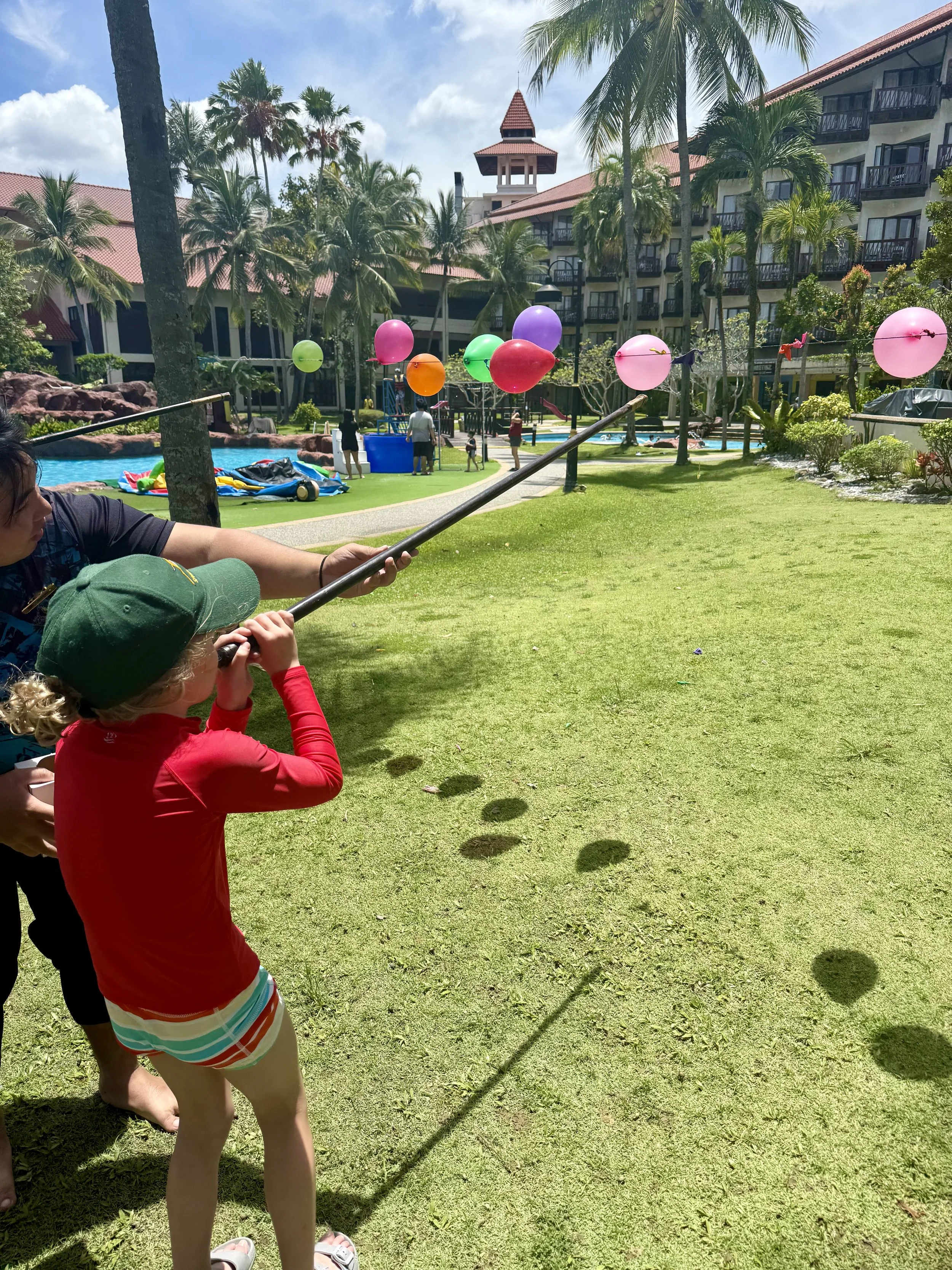 After the dunk tank it was time for another round of Water Wars! This time another boy and his sister were playing when we arrived. The people running the kid’s club asked us to wait for them to finish and then take our turn but all the kids were keen to play together. The boy and his sister offered our kids some of the balloons to shoot so we knew it was game on!