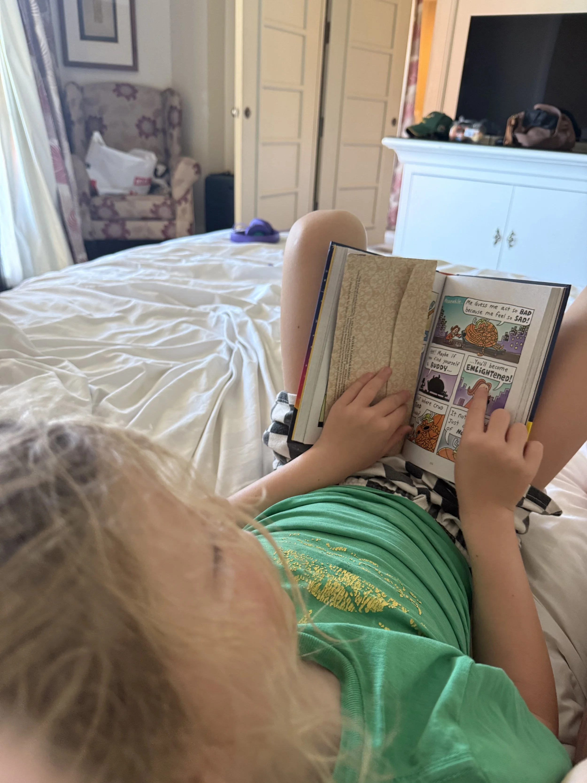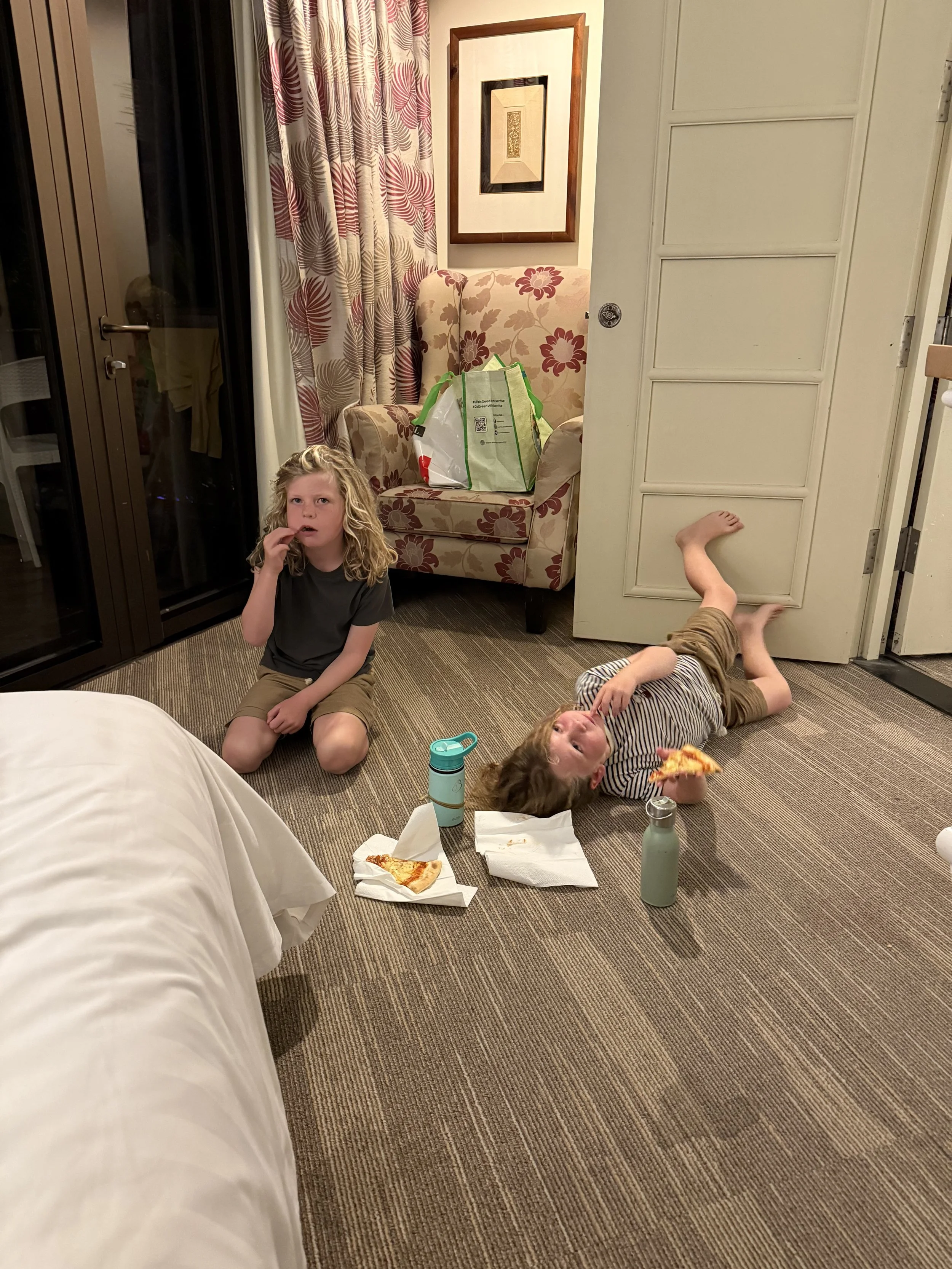 Once back at the hotel we ordered room service and did a bit of organizing for an airplane packing tomorrow morning. The boys can’t be trusted near the bed with food of any kind so agreed to enjoy their pizza on the floor instead of sitting at the desk in their room. Once sufficiently full they got to enjoy a show before heading to bed. Kayleen and I continued watching The Pitt once the boys were asleep.