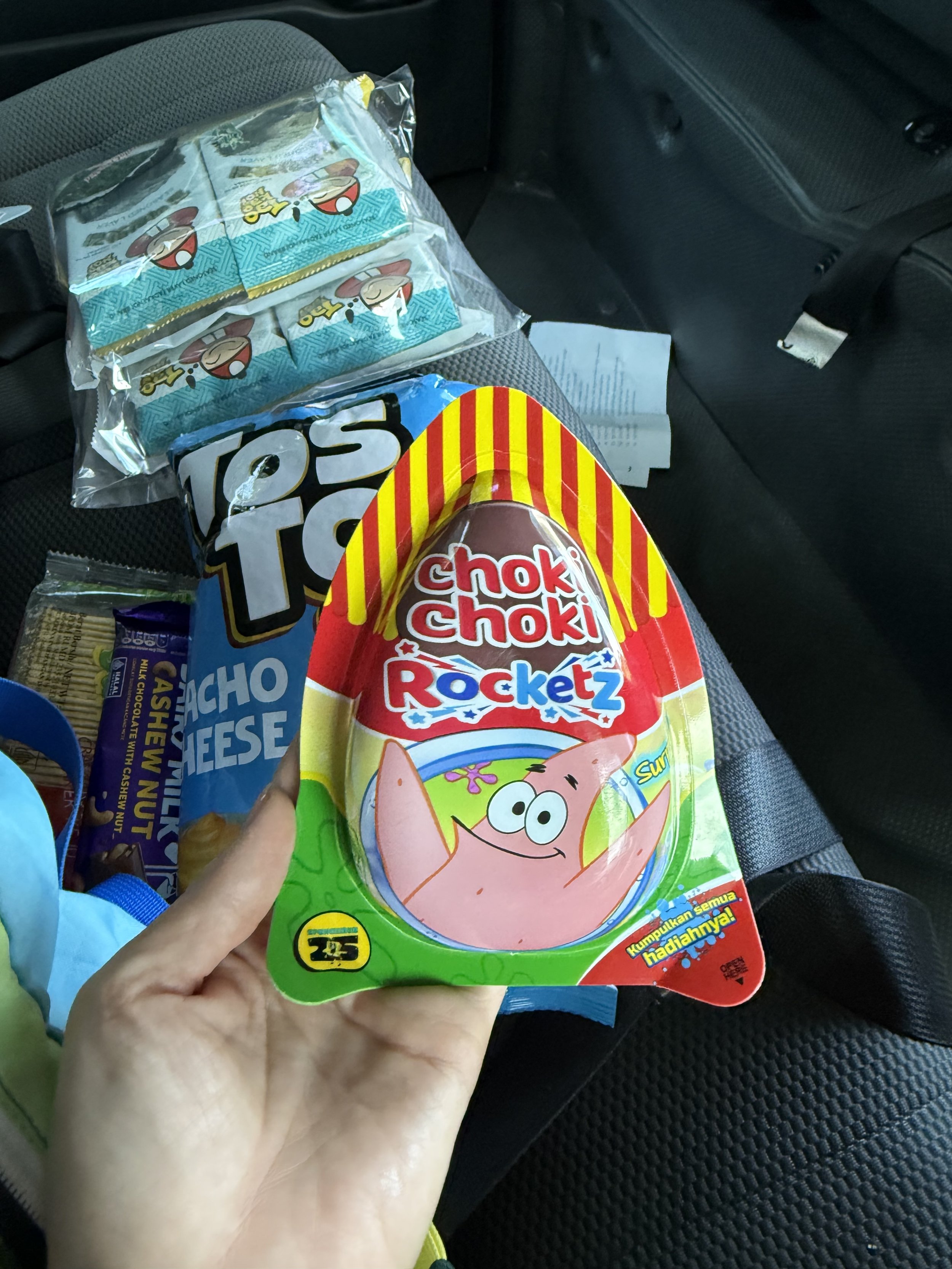 We stopped for a bathroom break at a mini mart and Len was eager to look for a giant kinder egg so he would spend his clean shirt game winnings. We found candy that looked close enough to what he saw yesterday so he bought one for himself and one for Ollie and still had ~70k Rupiah left. The eggs had the most annoying candy inside— small plastics tubes that were impossible to open and then challenging for the kids to get the chocolate out once open. These made a huge mess and tested Kyle’s patience.