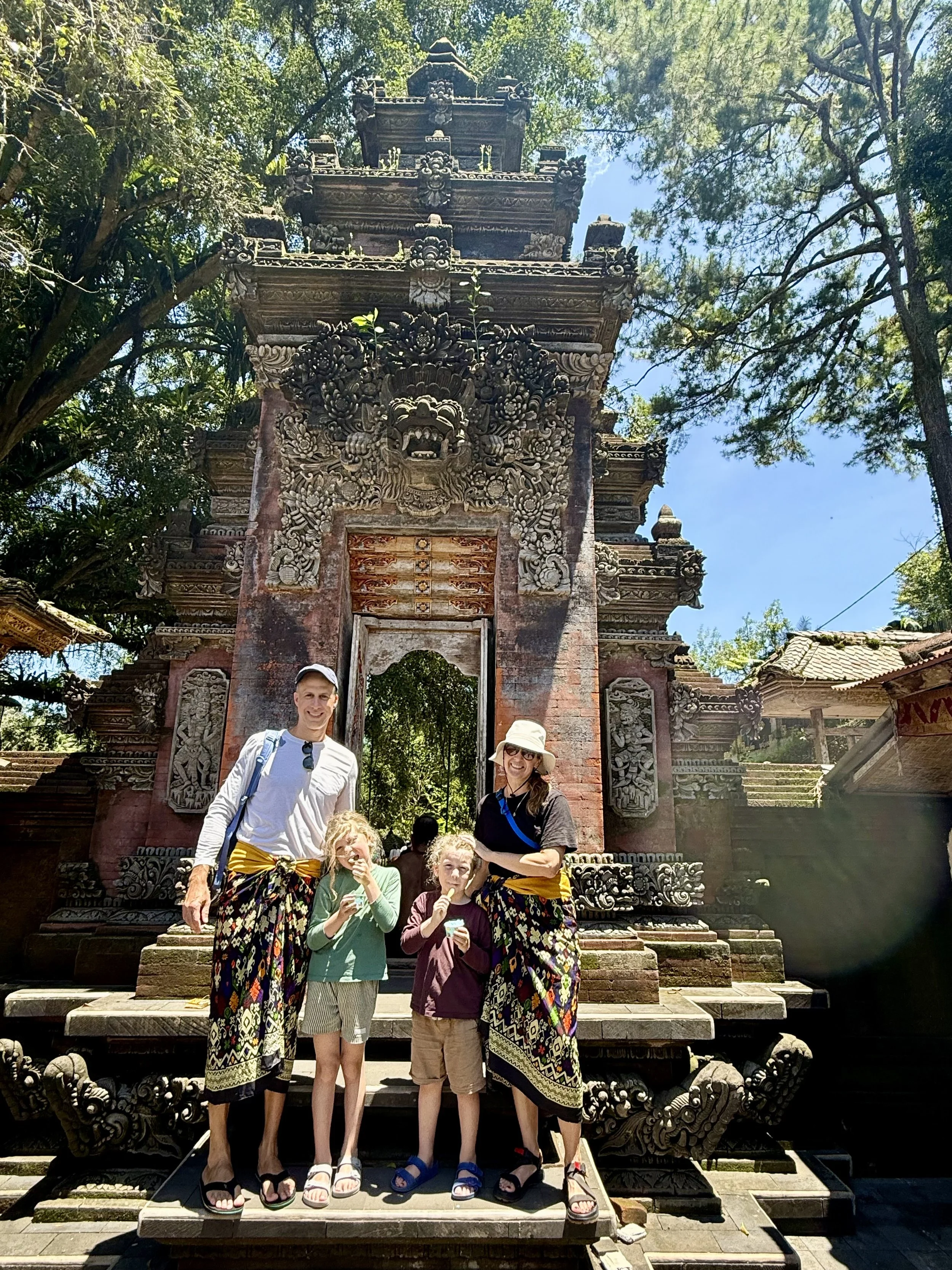 The next stop was nothing short of Instagram hell. Our itinerary made it sould like it would be a walk through some rice terraces and maybe a chance to ride a big swing but this place was nothing more than a content farm for influencers and tourists. The surroundings were beautiful but all beauty was erased with the amount of navel gazing, obnoxious posing and queueing to do simple tasks. Women were all wearing a version of the same long, flowy vibrantly colored dress to try and get a picture of themselves emulating a very famous Balinese picture on instagram. The kids saw the huge swings and were desperate to go on one but they were only allowed to go on the “bed swing” due to their size. Thankfully, no influencers were interested in this swing so there wasn’t a wait. We concluded this stop by wading through people to get a picture of the kids in front of the gorilla cave. At one point, Kyle was recruited to join this random guys’ content team and followed him briefly to get some action shots. We got a good chuckle out of this interaction but overall felt like we couldn’t get out of the place fast enough.
