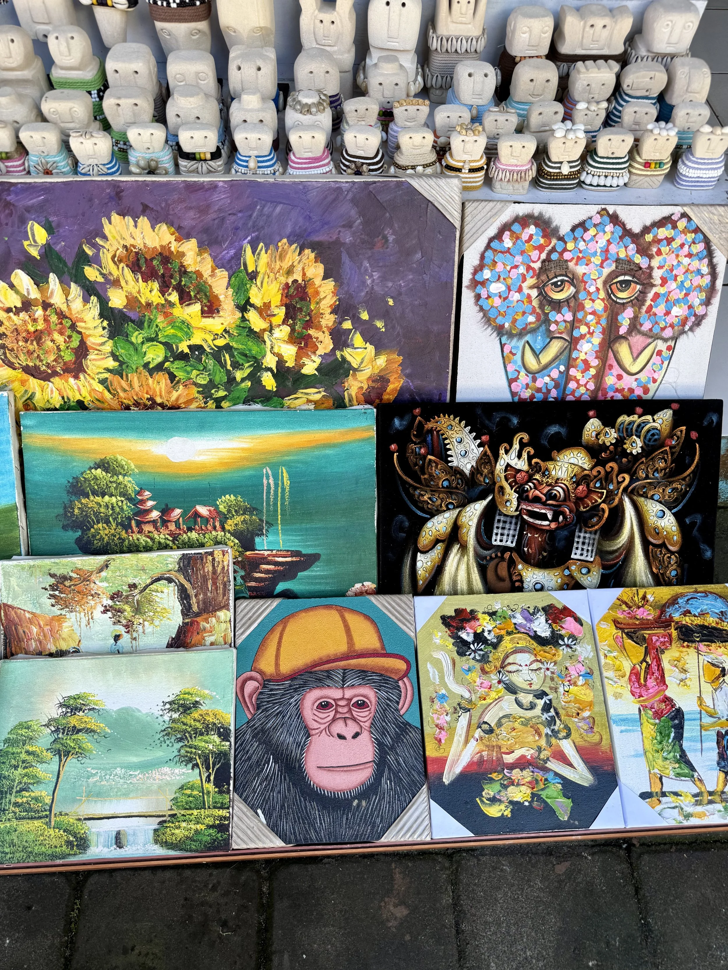 As we walked through the vendor stalls towards the exit, Len was anxious to spend his leftover money. Instead of calling it his change he kept calling it his “payback” and asking, “When can I spend my payback??” I figured he’d be looking for a toy but when he saw a small painting of a gorilla with a baseball cap, his sights were set. The vendor said it was 100k but when she learned he only had 70k she gave in.