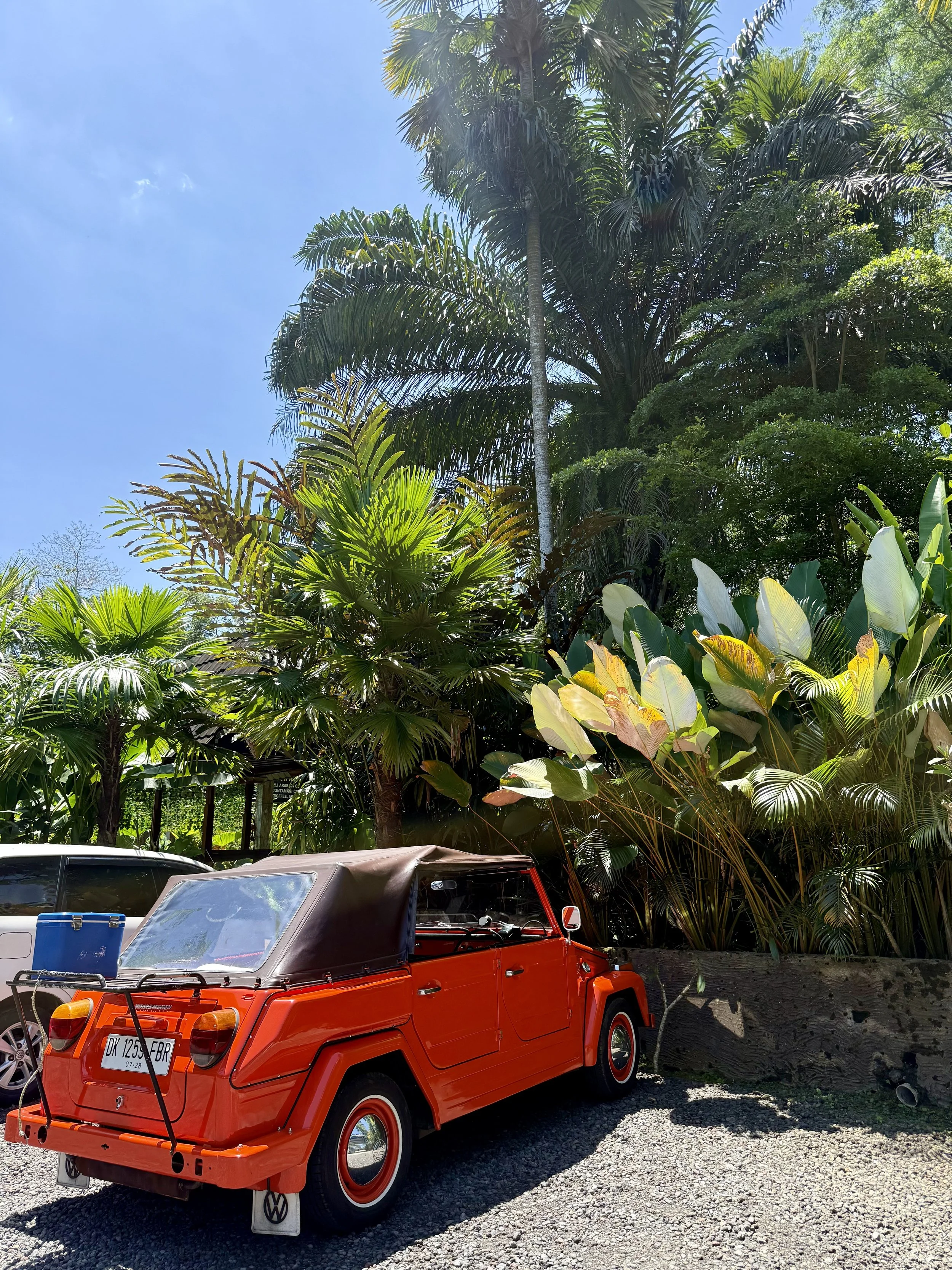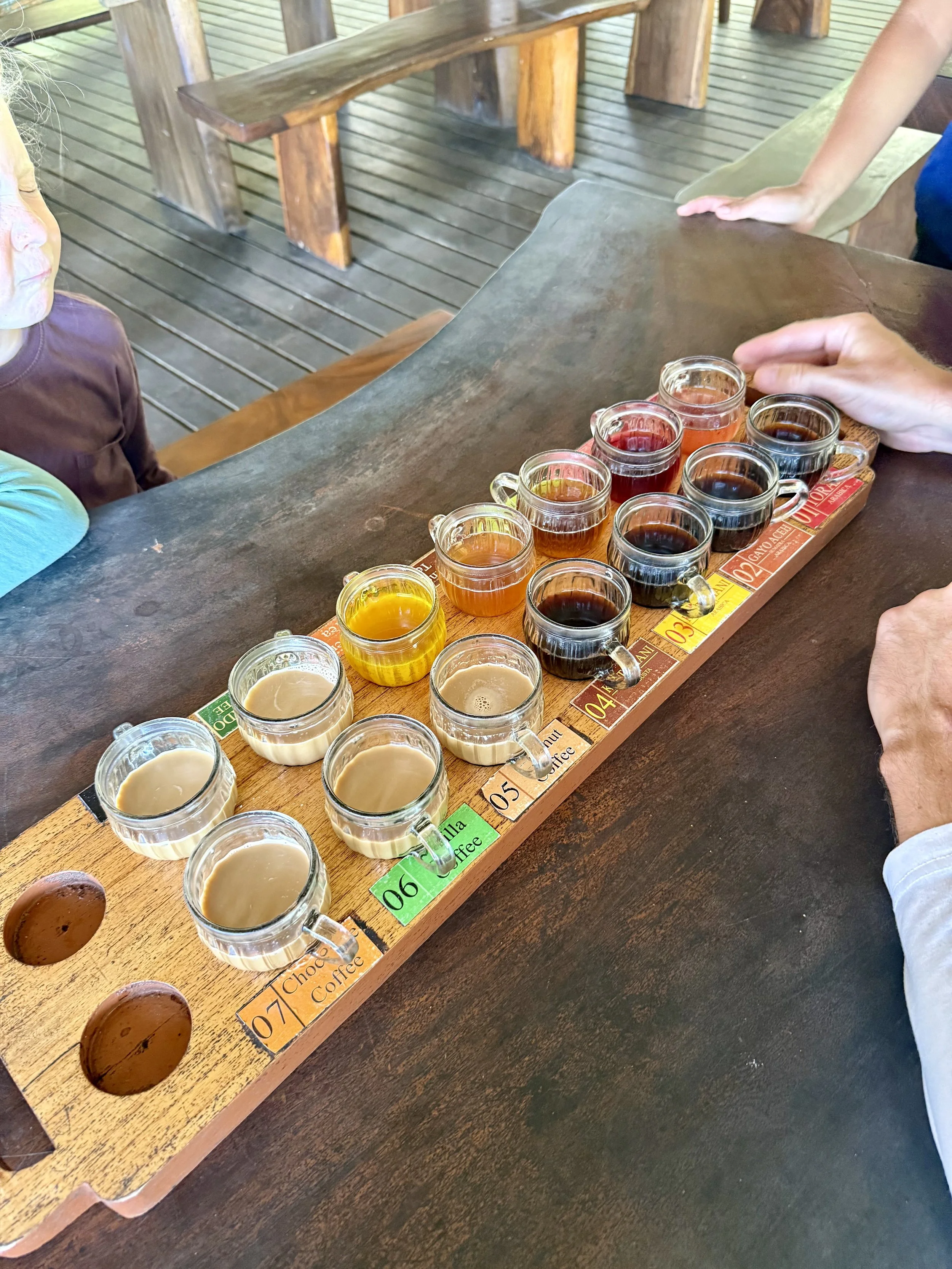 Next we went to a botanical garden and coffee tasting room. At this point it was pushing 2pm and the kids were hot and hungry. Saw the luwak (Indonesian raccoon) that eats the coffee berries and poops them out whole– the beans are then carefully collected and roasted for Luwak coffee. If it wasn’t so late in the afternoon on empty stomachs, Kyle and I would have tried it but we stuck with the free tasting flight instead. Ollie was a fan of some of the teas but Len was essentially fully off the rails at this point and we struggled to get through the tasting. We picked up some rosella tea from the gift shop and made our way to lunch.