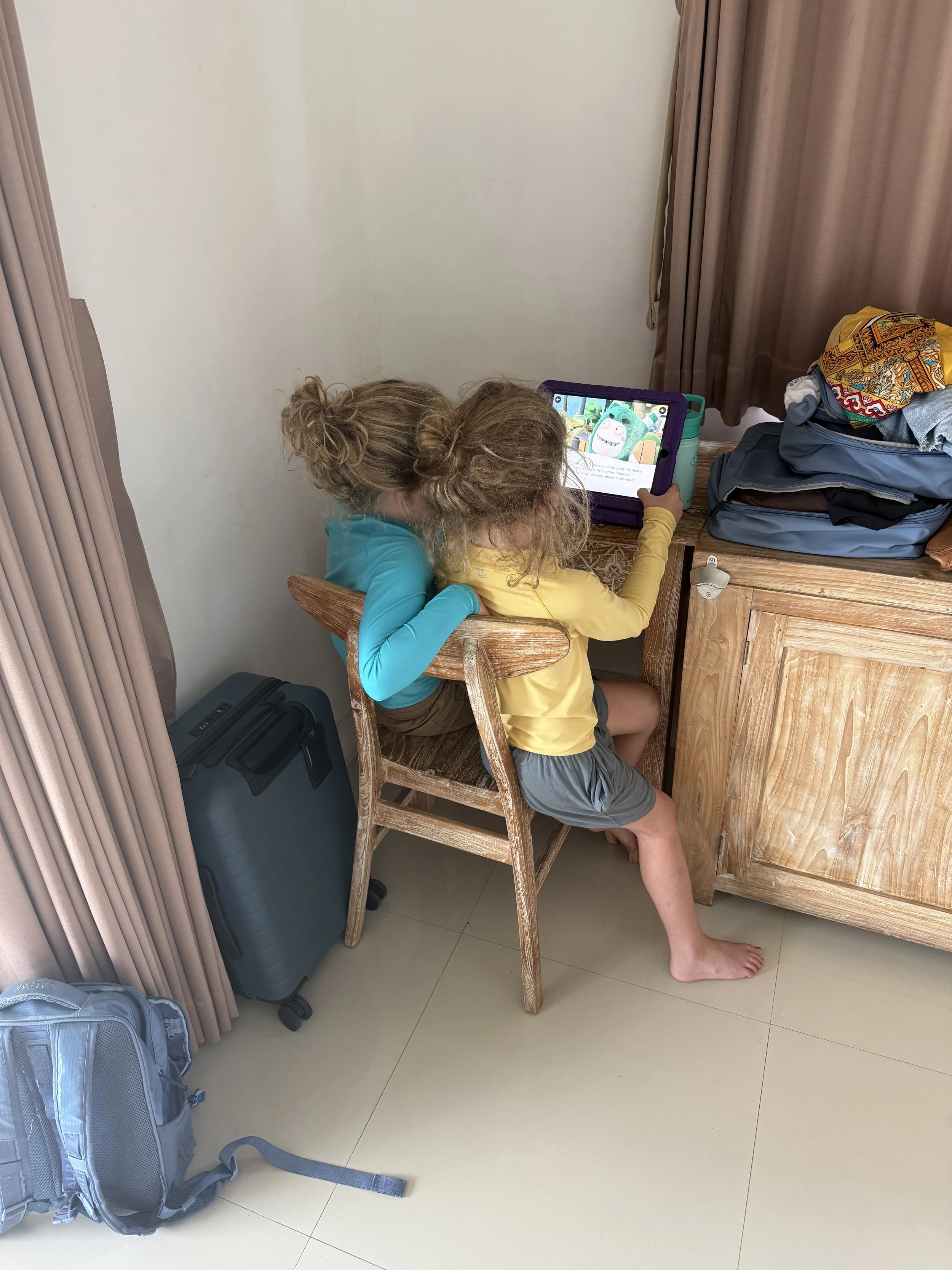 Everyone was worn out from all the car time yesterday. We had a slow morning and eventually made our way to breakfast. It was a plated breakfast day so Lenny was disappointed. Then we headed back to the room for home school where Ollie wrote a letter to his 1st grade teacher and class, Mrs. Alyssa. Knowing school is back in session at home has left him a bit sad and missing his friends. Lenny and I read some books on his iPad and then did the normal math work. As school was wrapping up, the boys squeezed themselves onto one small chair to listen to a story read by one of the learning apps.