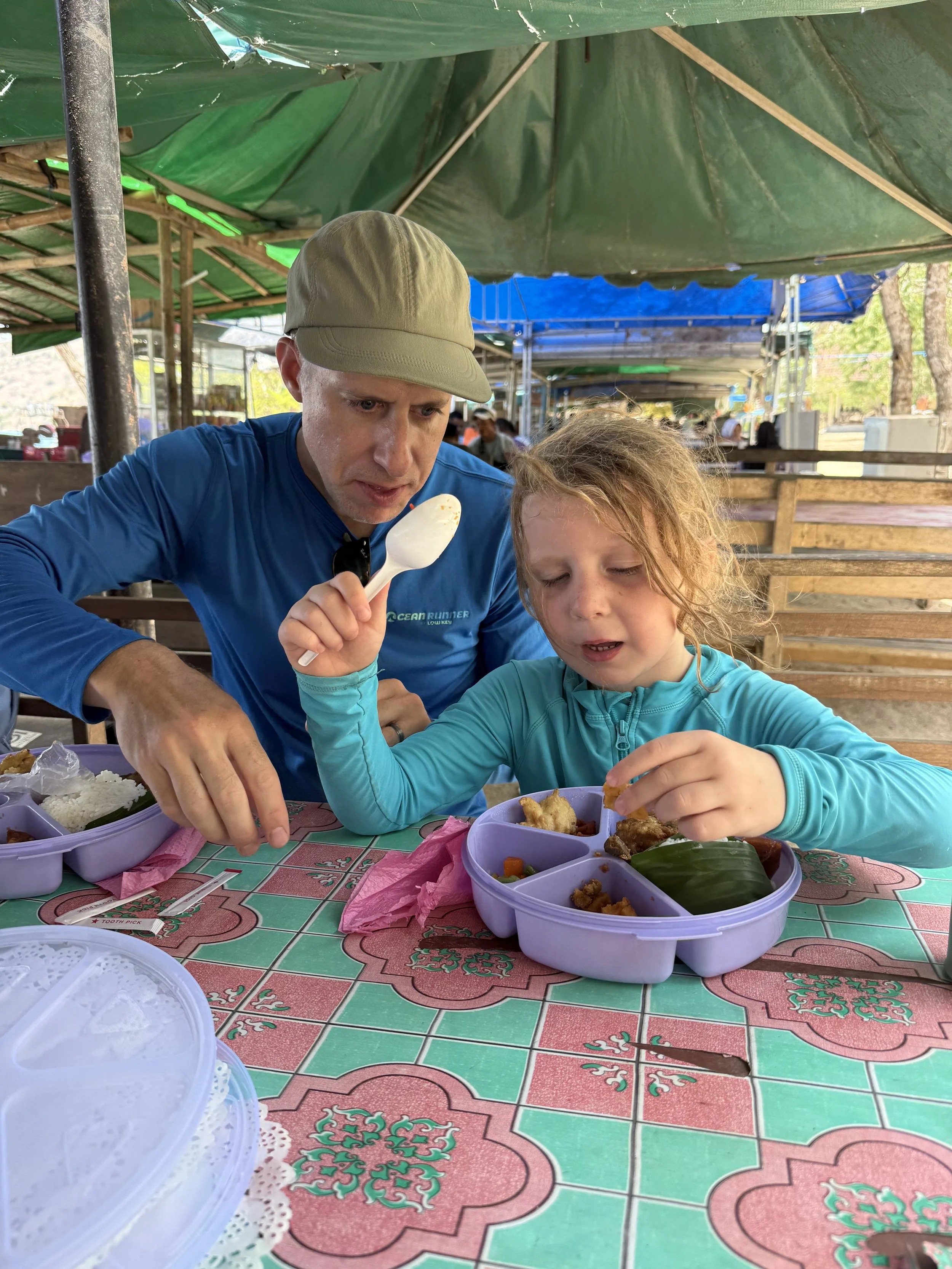 After our dragon trek, we enjoyed an Indonesian lunch on the beach. Len learned that he kind of enjoyed tofu after learning it was made from beans. Ollie stuck to mostly the rice while Kyle and I enjoyed all of our packed lunch.