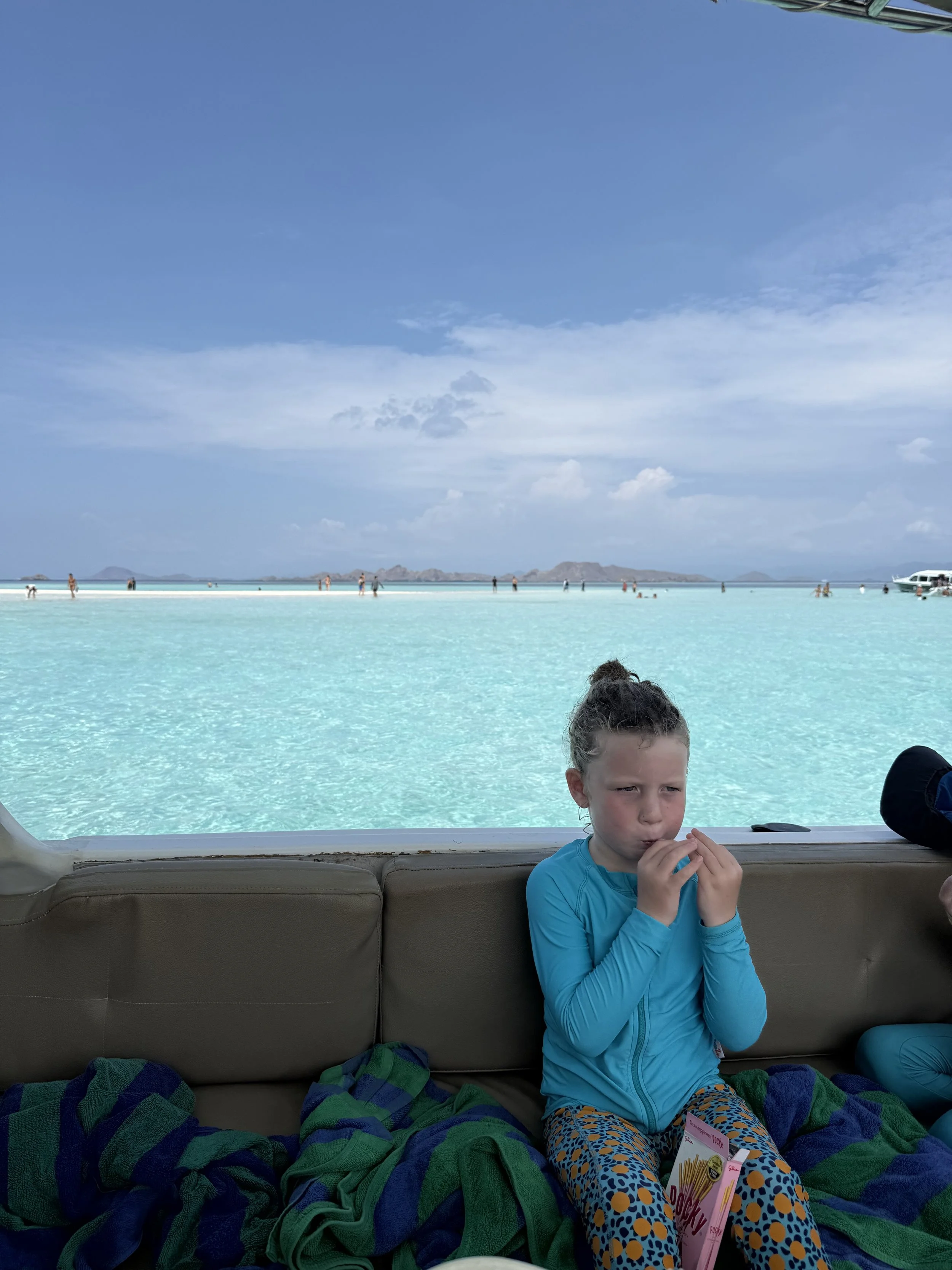 Next we made our way to the Taka Makassar sandbank which had crystal clear blue water in contrast to the litter laced brown-ish water near Komodo island. Both boys were excited to go snorkeling and wear flippers for the first time. The water was only 3ish feet deep but the current was quite strong. The boys needed a good amount of support from us to ensure the current didn’t take them away but to also repeatedly reposition their goggles and snorkel. Len struggled the most with his goggles and snorkel and repeatedly took in mouthfuls of sea water and would rip his mask off entirely each time he removed his head from the water. At one point while messing around, Len put his mask on and snorkel in his mouth then showed off his back float (fully submerging his snorkel underwater) then took a big breath in of water straight to his mouth. It was ridiculous and a very Lenny thing to do. I went back to the boat early with Len to drink some water and have a snack. While on the boat, we both excitedly watched as a baby white tip shark swam by. We were assured they were not dangerous and had been told to be on the lookout. Ollie had a glimpse of a baby shark earlier, too, and the boys were thrilled with these sightings.