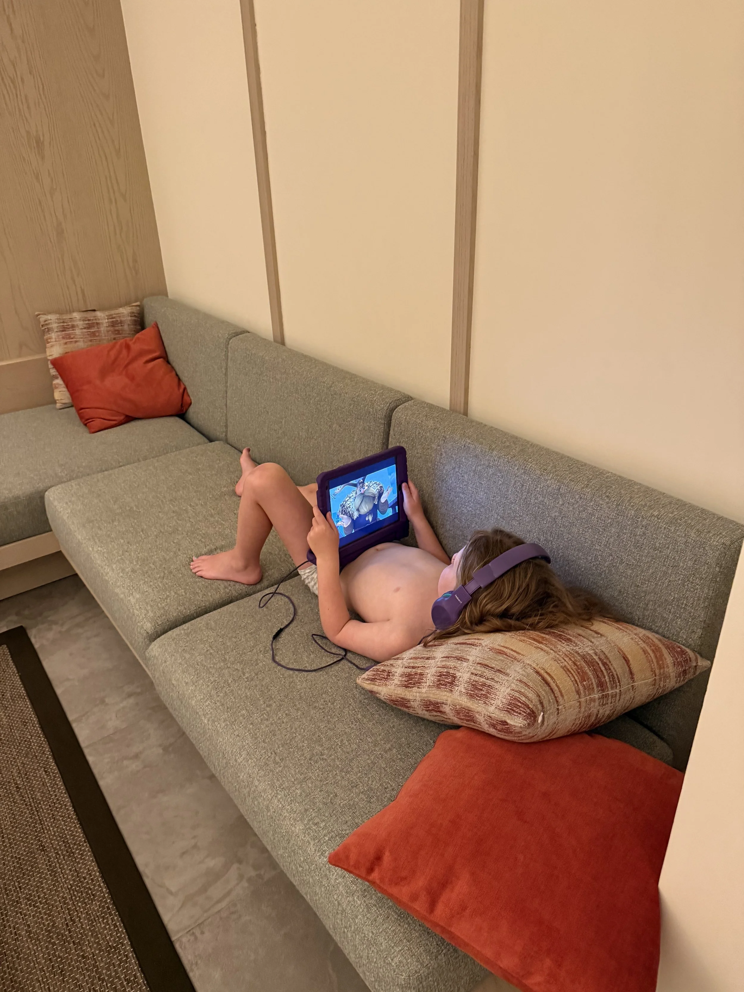 Kayleen headed to one of the daybeds by the pool to read and work on blog posts while I went to the gym. Once I finished, I swam in peace for a little while before going to get the boys. Another boy who was eight and his older sister were there with their mom. They did not speak English but the mom did and she was sitting on the floor playing foosball with Ollie and chatting. She said how nice it had been to talk with him and we all left for lunch.