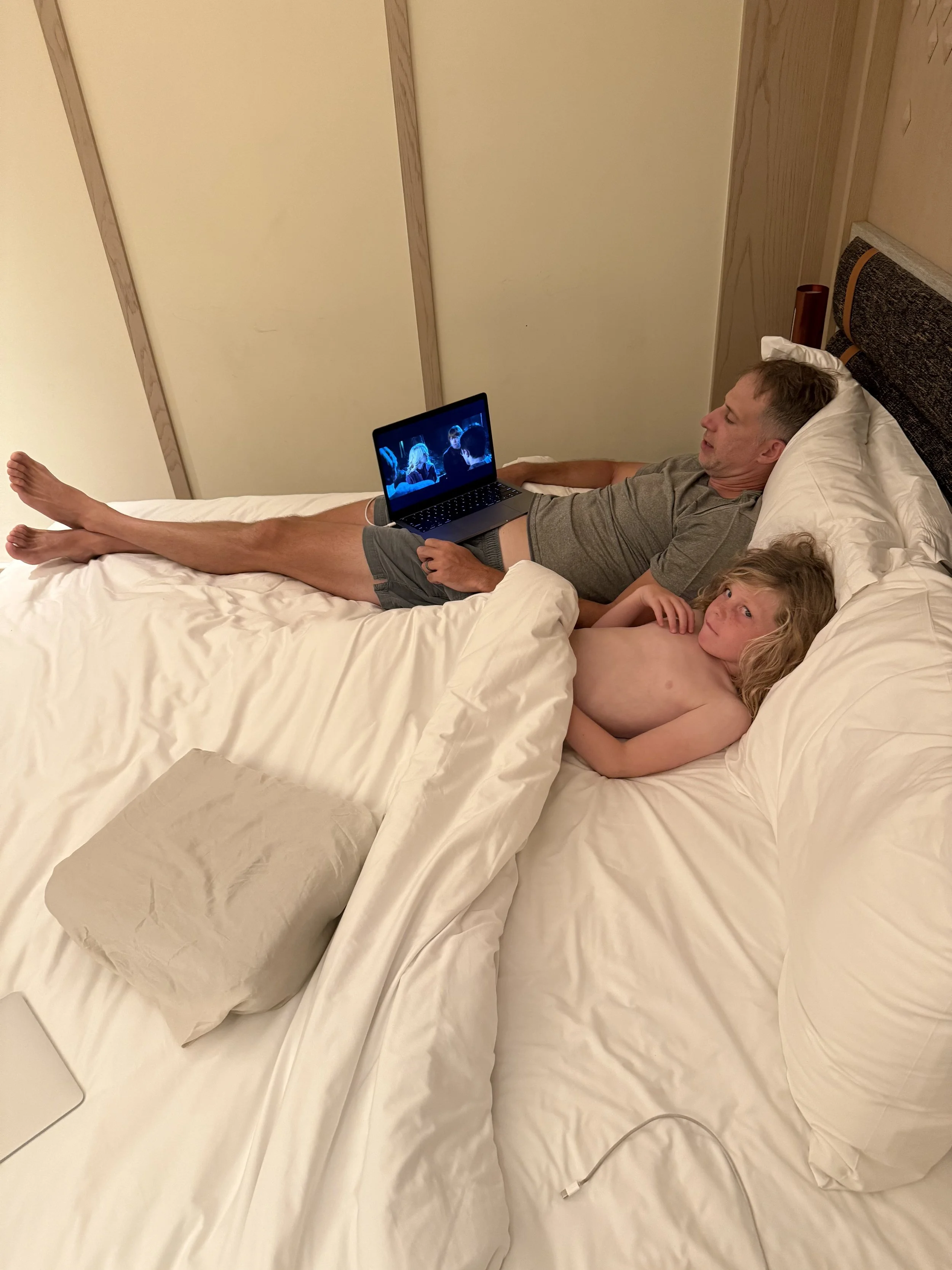 After the movie it was time for bed and was Kayleen’s turn to be on bedtime duty. When putting the kids to bed, Lenny asked her, “Will I remember cappy when I’m a grown up?” Referring to his stuffed capybara from the blind box in Beijing. Then asked her if she remembered any of her stuffed animals from when she was a kid. She told him about a white bear with a blue ribbon that she believes was unnamed.