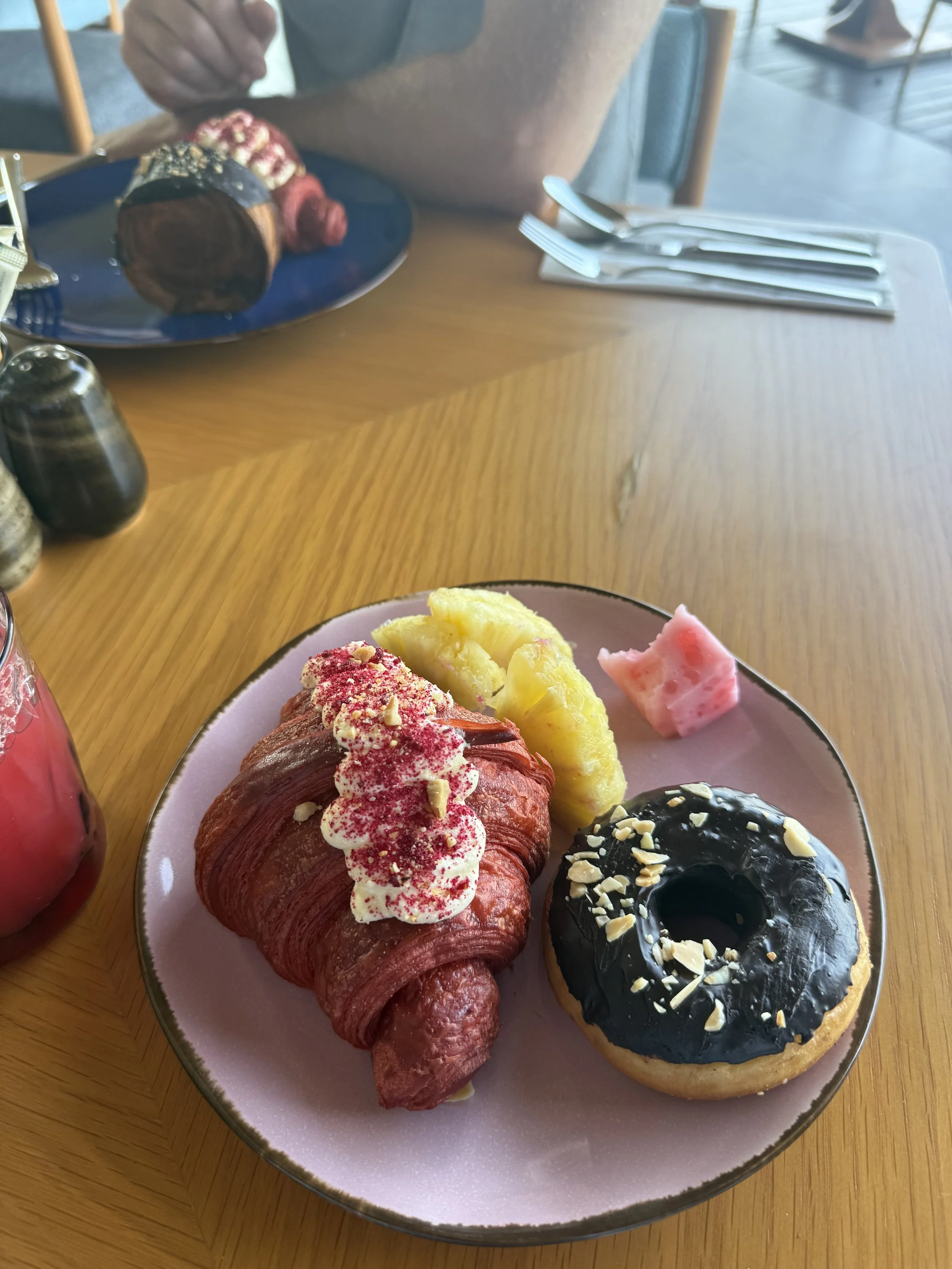At breakfast, there was a new red velvet croissant that Ollie and Kyle had to try out. This hotel probably had the best breakfast yet on the trip. The boys also ordered their Belgian waffles with Nutella and we took the same chocolate muffins and mini bananas for homeschool snacks.