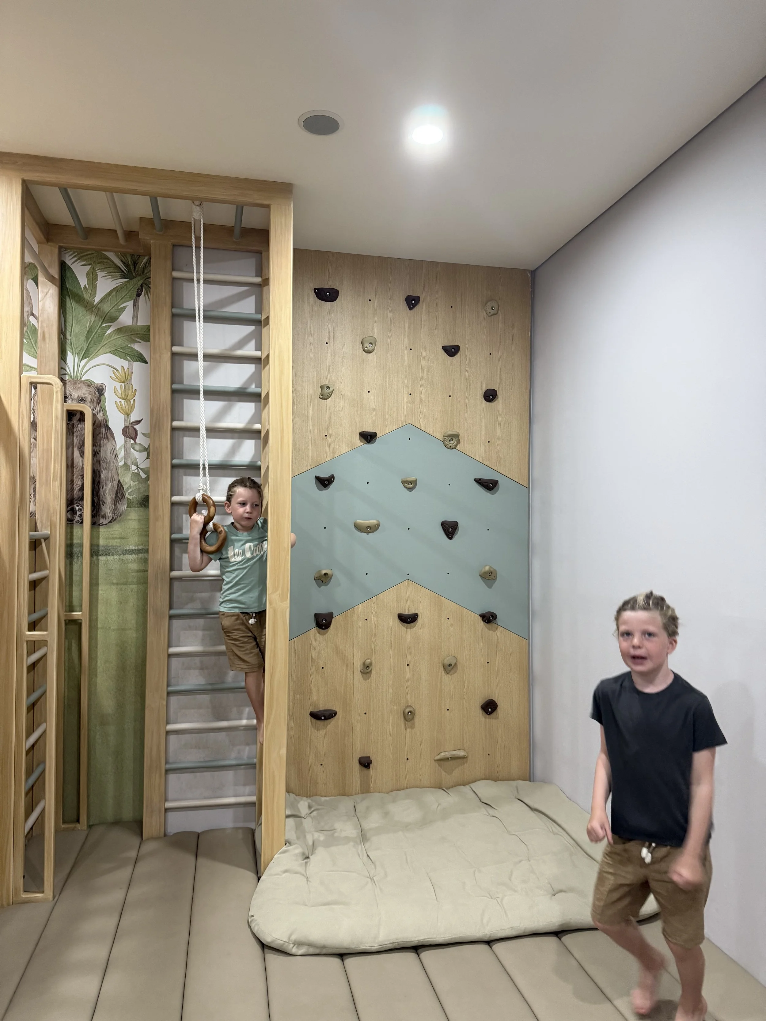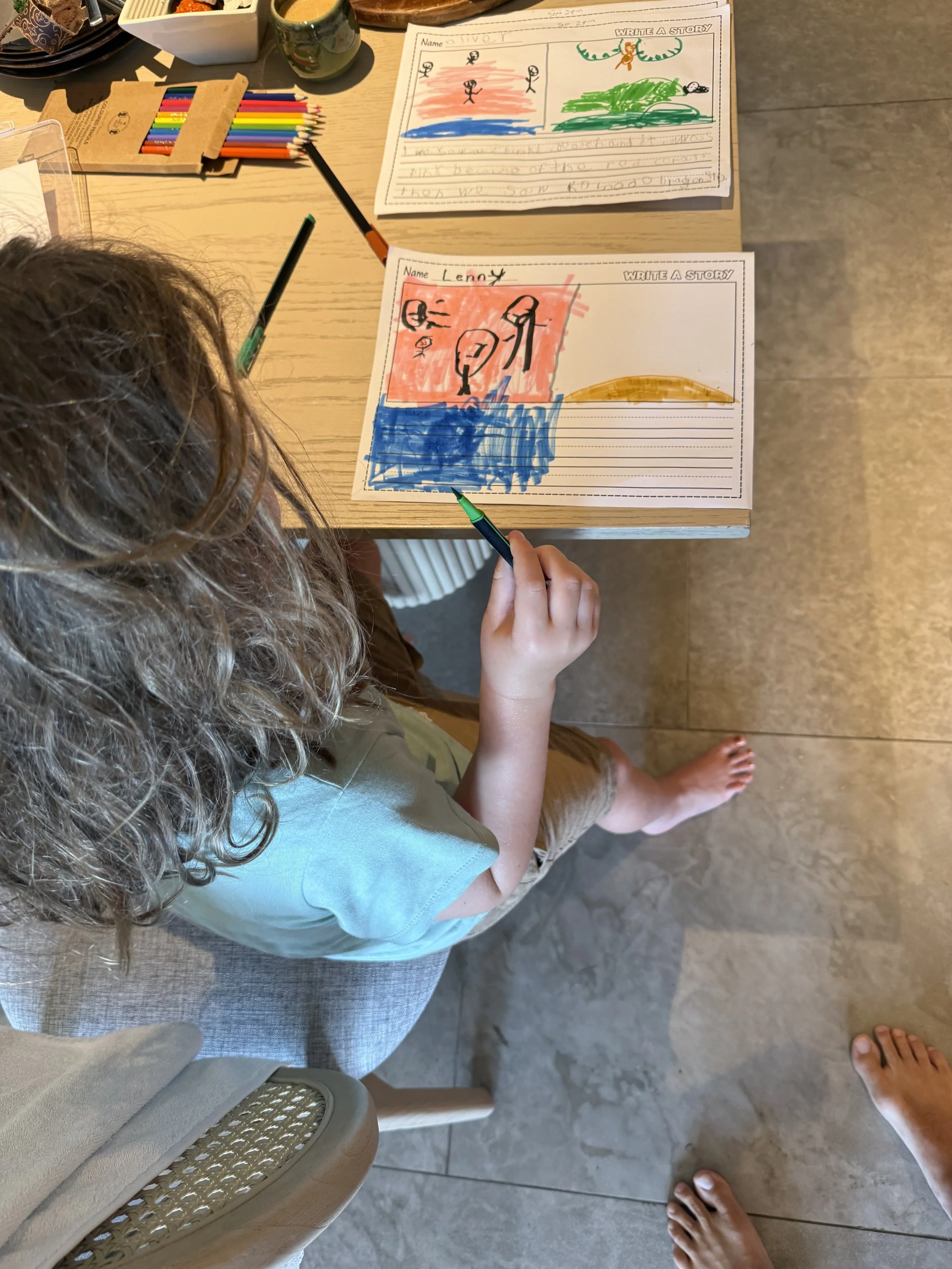 Len was inspired by Ollie’s mini story from yesterday and wanted to write his own today. He took Ollie’s pages “for inspiration” but ended up doing his best to copy them explicitly. After homeschool the boys wanted to return to the kids club but mostly just to show us how they climb the wall and use the jungle gym. When Kyle was in the gym down the hall, the kids snuck out of kids club to come find him to let him know they were ready to leave.