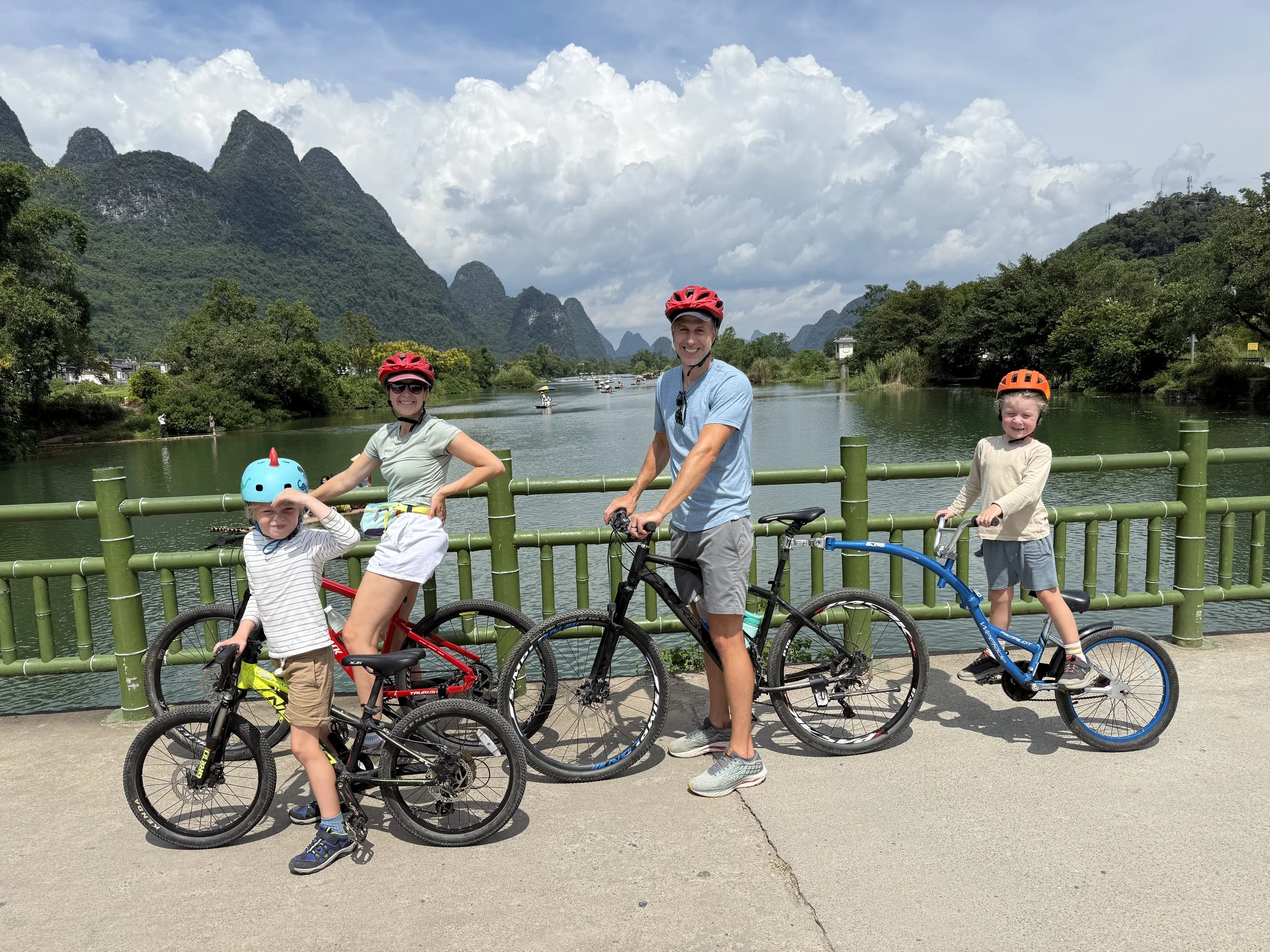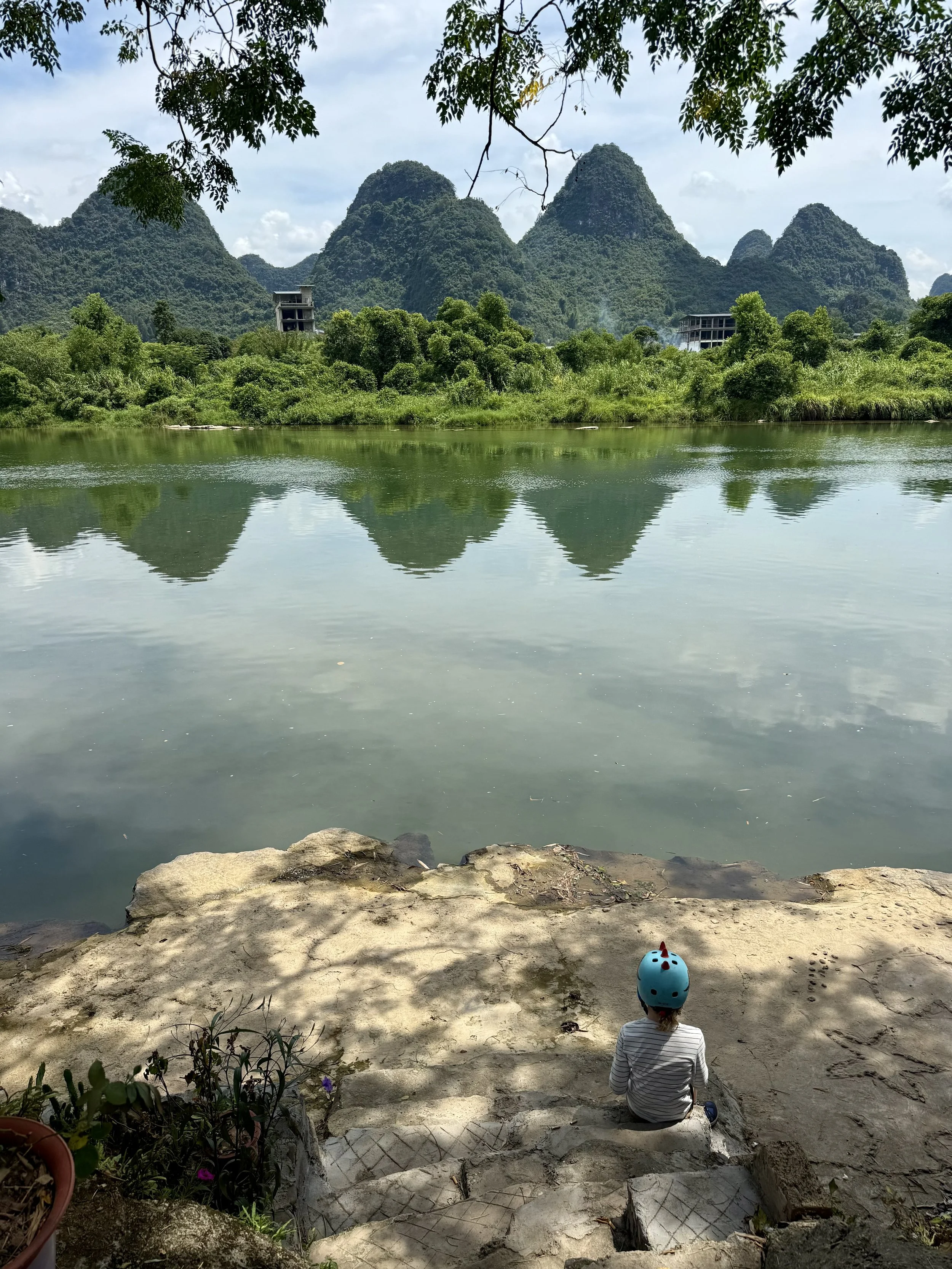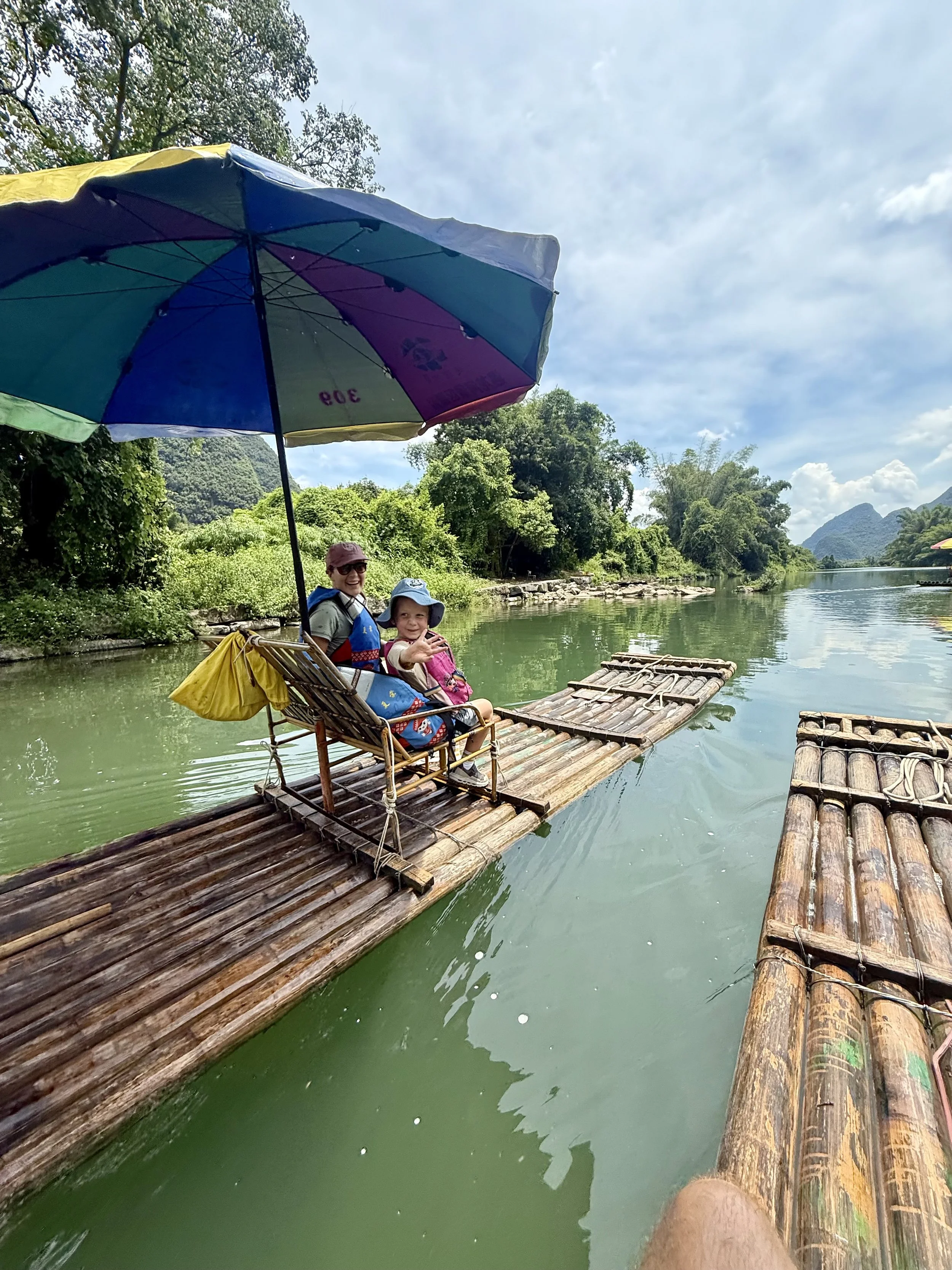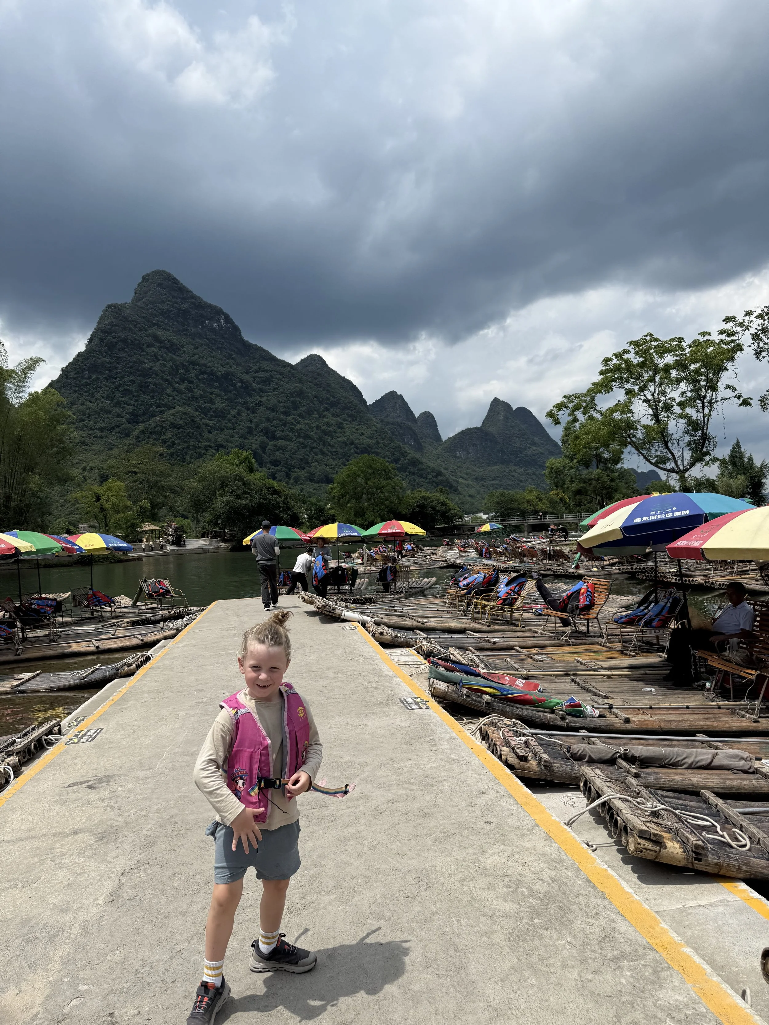 Our first activity of the day was a tour of the Yangshuo market with Michael. While at the market, Ollie ran over to see cats and dogs hanging at one of the stands. I watched as he ran over to tell us and he was so startled he nearly got taken out by two different mopeds. We had a talk about not saying “gross” or “yucky” to different foods before we went to the market so Ollie was just quietly stunned. Len was most surprised that they sold live pigeons at the market, “how do people eat pigeons???” The kids also loved to see the turtles and frogs until they learned they were for food. Ollie asked, “do you eat the frog legs like in France?” and Michael let him know they typically eat the whole animal save for the head. We bought some big red figs before we left and the concept of “keeping the change” didn’t translate and instead the woman kept adding figs to our order until they weighed exactly 20 yuan worth (less than 3 USD). We also got the kids mini gummy hamburger skewers for a snack.