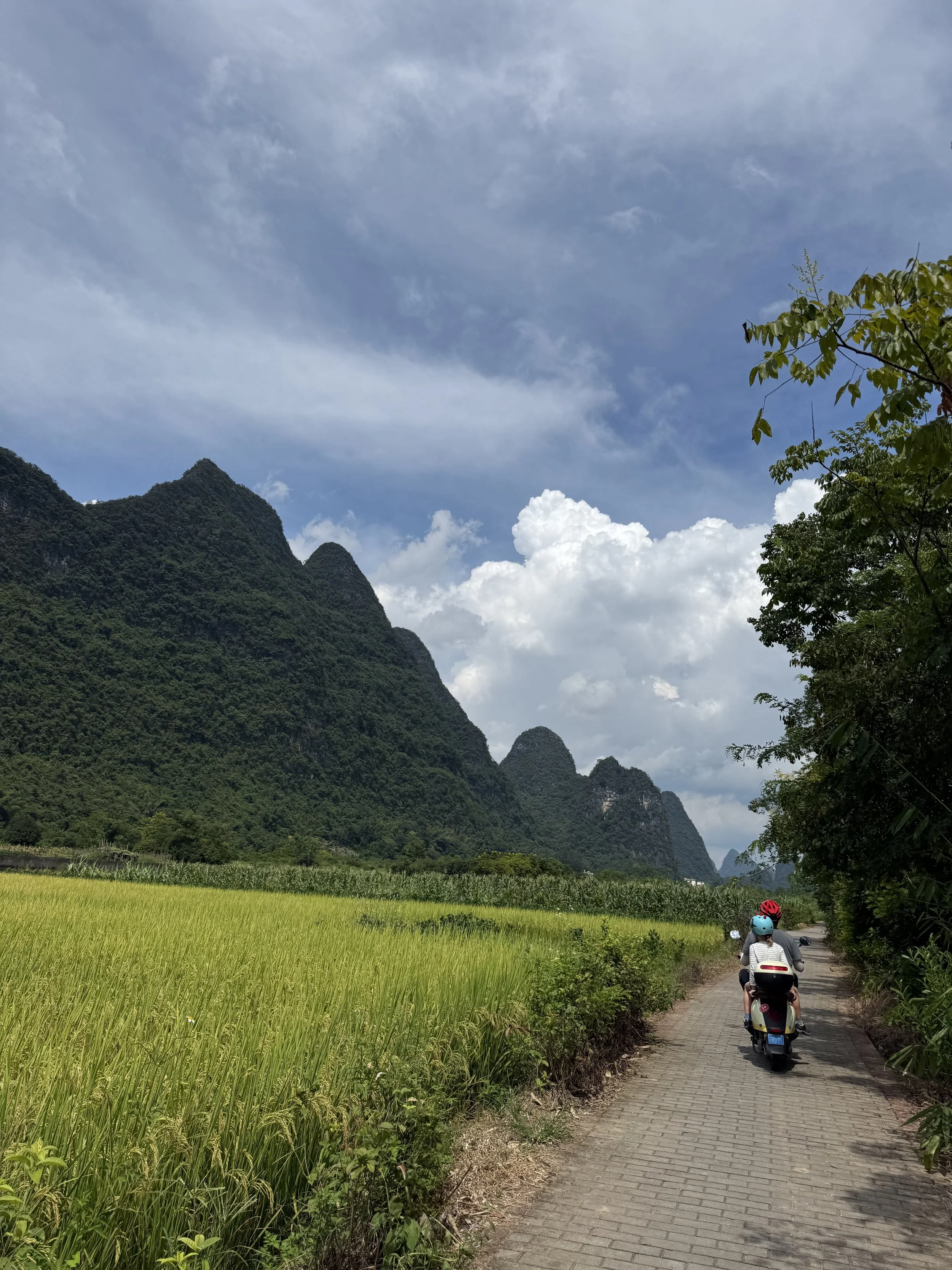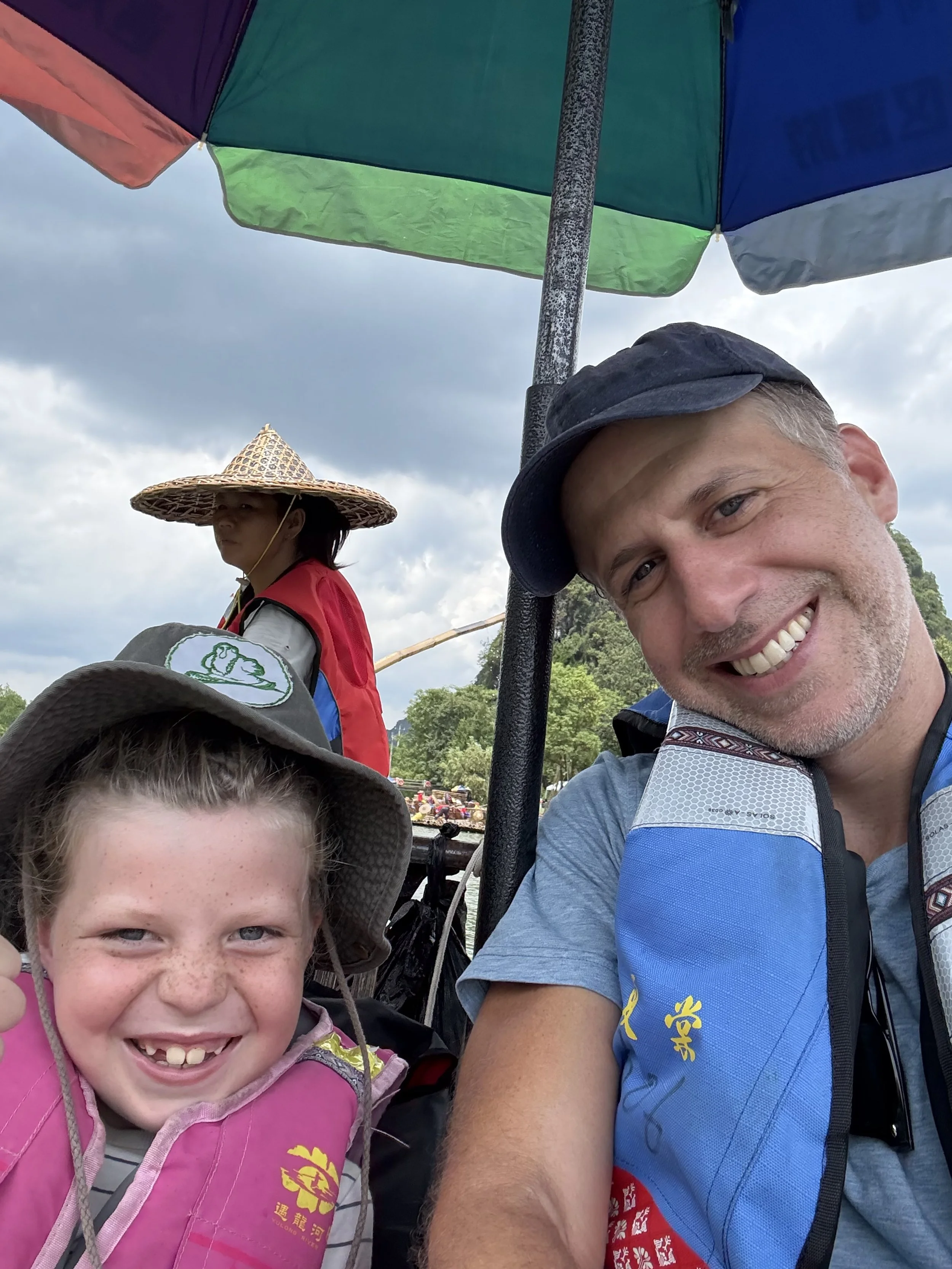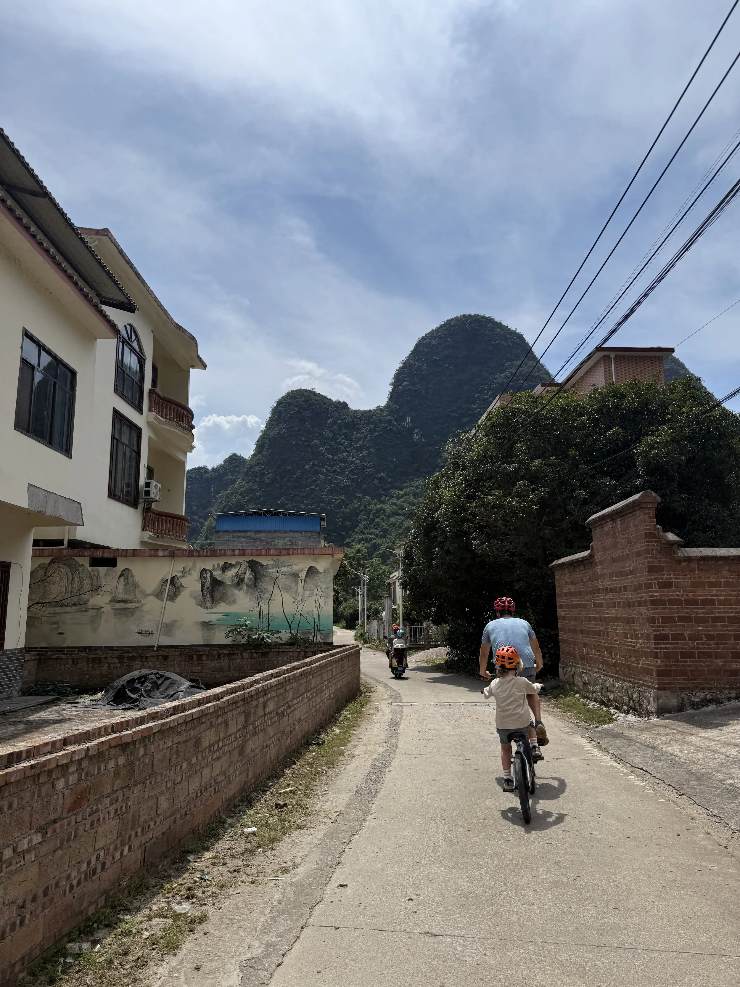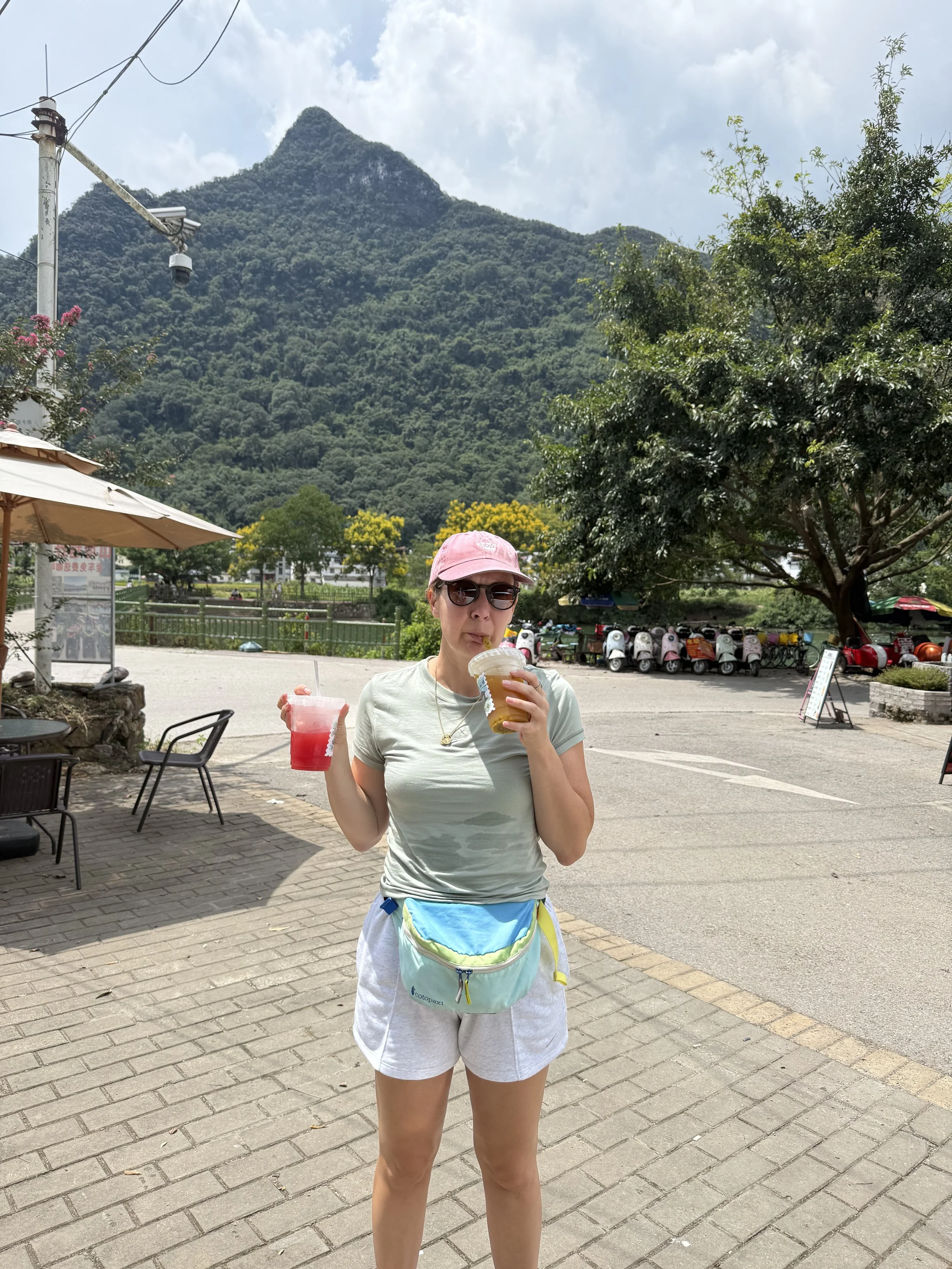 Our first activity of the day was a tour of the Yangshuo market with Michael. While at the market, Ollie ran over to see cats and dogs hanging at one of the stands. I watched as he ran over to tell us and he was so startled he nearly got taken out by two different mopeds. We had a talk about not saying “gross” or “yucky” to different foods before we went to the market so Ollie was just quietly stunned. Len was most surprised that they sold live pigeons at the market, “how do people eat pigeons???” The kids also loved to see the turtles and frogs until they learned they were for food. Ollie asked, “do you eat the frog legs like in France?” and Michael let him know they typically eat the whole animal save for the head. We bought some big red figs before we left and the concept of “keeping the change” didn’t translate and instead the woman kept adding figs to our order until they weighed exactly 20 yuan worth (less than 3 USD). We also got the kids mini gummy hamburger skewers for a snack.