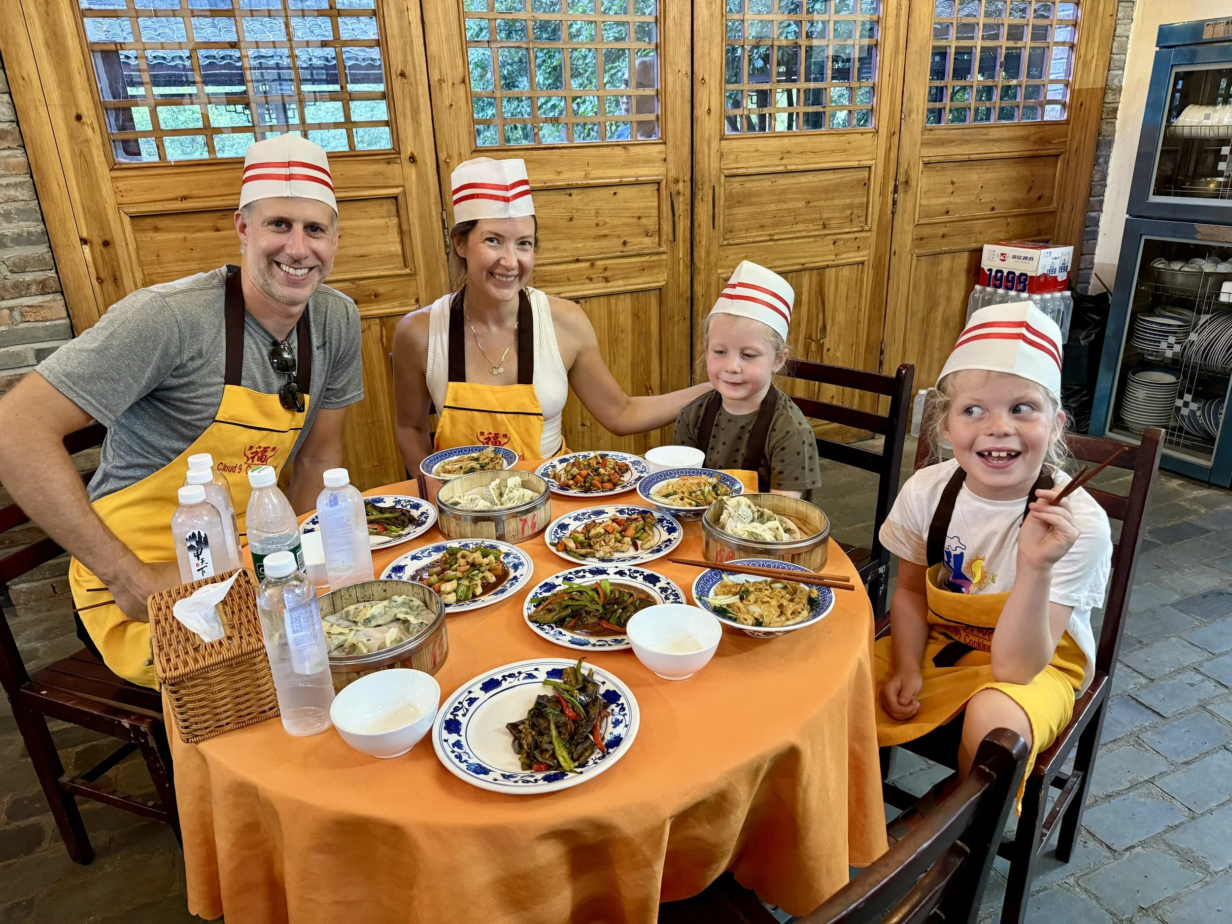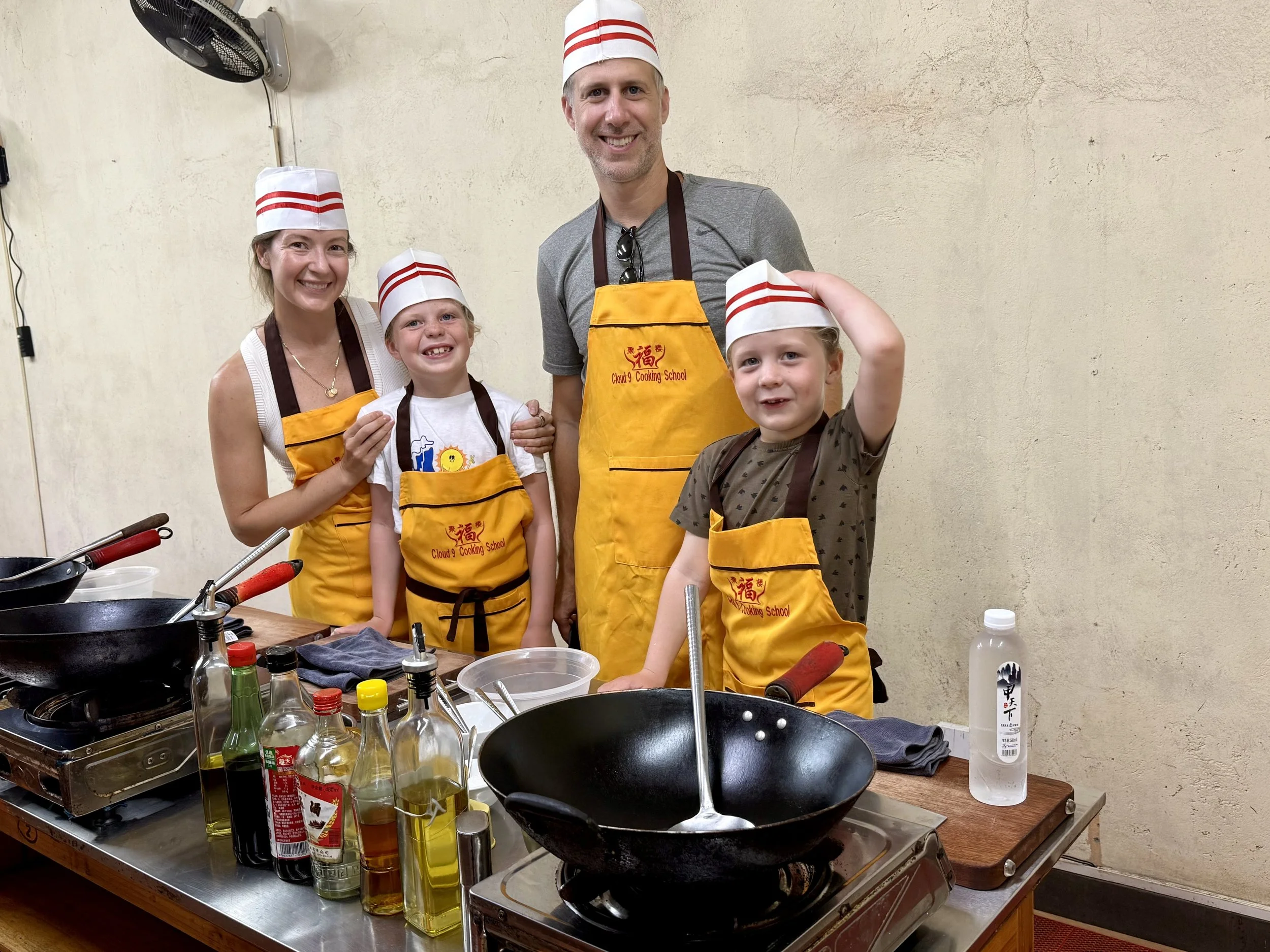 The next portion of the class was a lot of chopping produce to prepare to cook the rest of the dishes. Oliver’s confidence with the cleaver continued to increase with his skill lagging behind but he knew his limits well enough to accept my help. The last section of the class was cooking the dishes in the high heat wok. Again, Oliver refused help when he absolutely needed it. Standing close to the open fire and hot woks we were all heating up and bickering with Oliver about not touching the hot wok almost sent me over the edge. At one point, instead of dumping raw chicken from the bowl into the wok he threw the entire metal bowl into the very hot wok. We all recovered and finished the cooking portion but were all drenched in sweat by the end. Oliver probably ate 15 dumplings for dinner while meticulously grading each team’s wrapping skills. He gave me an A (“Not quite A+ work mom but close”) and Kyle and Len a B+. While Len was proud to point to all the dishes he contributed to making, he stuck to eating mostly rice noodles.