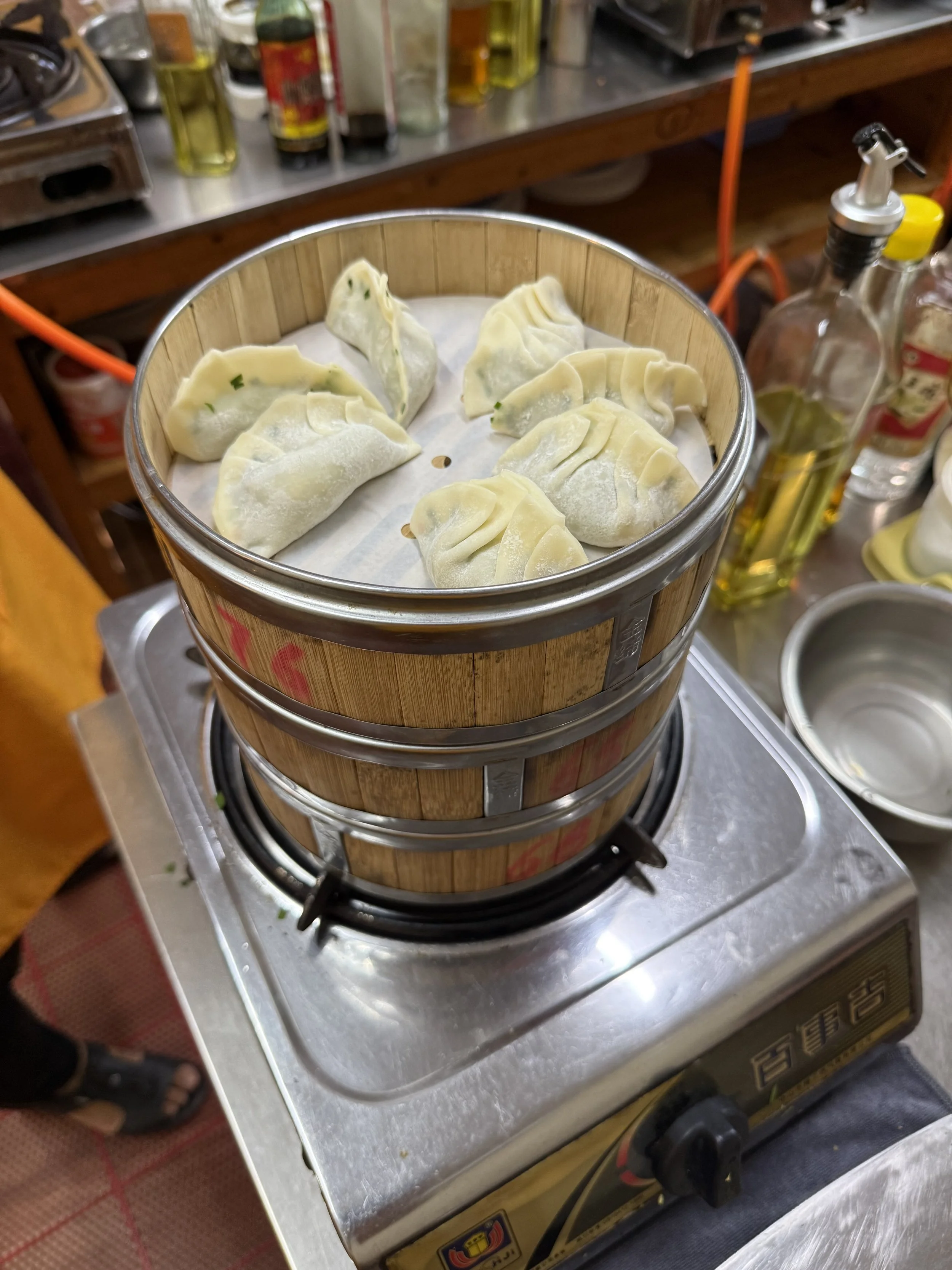 The first recipe we prepared was pork and chive dumplings, Oliver’s favorite Chinese food. We used store bought wrappers but prepared the filling and wrapped them ourselves. Oliver was keen to do all of the wrapping entirely himself even when the intructor walked by to help him. Len was happy to tag team with Kyle and took his duty of wetting the wrapper with his finger seriously. After making the dumplings Len says unprompted to Kyle, “That sure was fun, Daddy!”