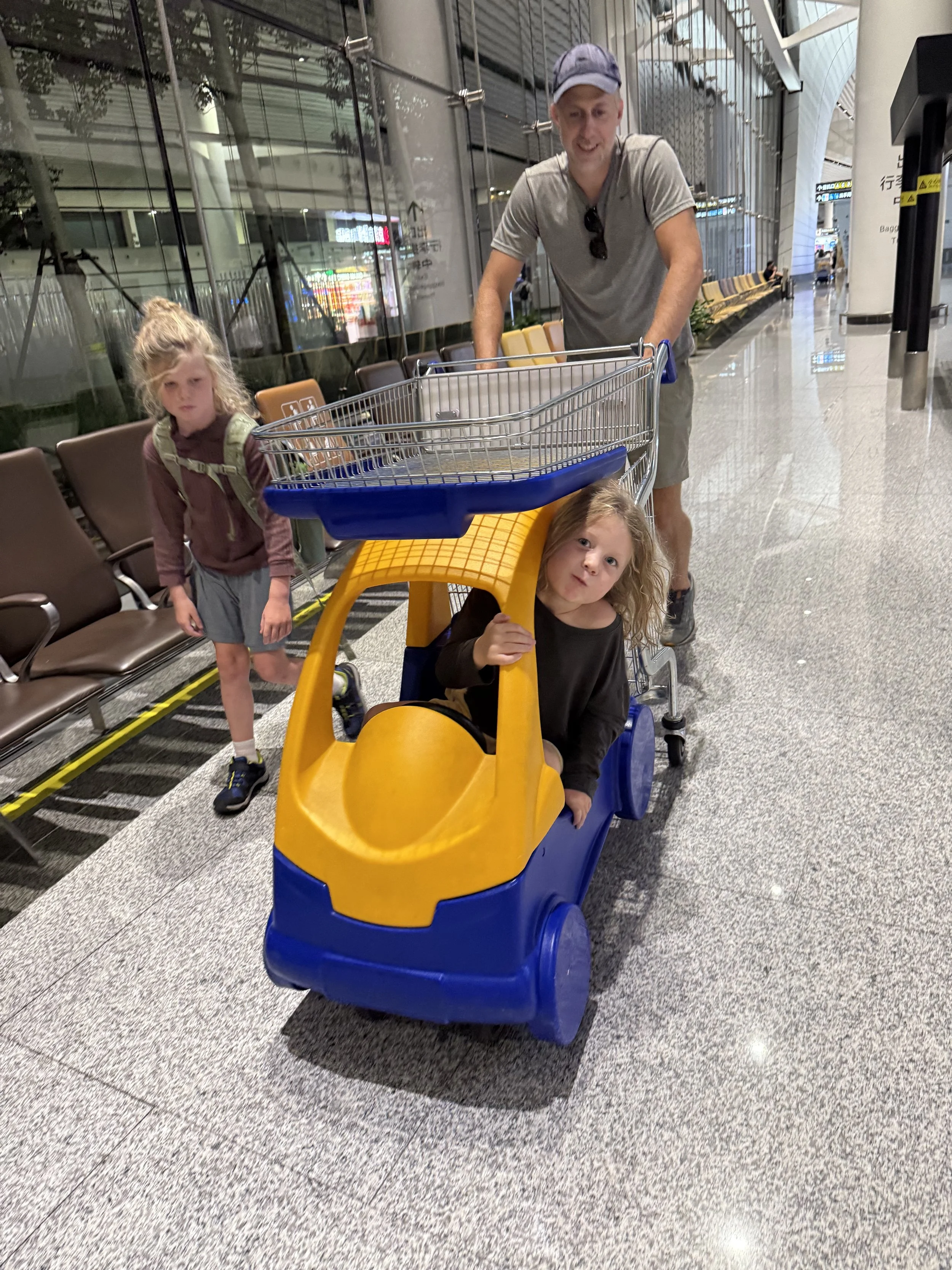 Once we landed, he was rested and in a better mood but begging to ride one of the free car-luggage carts in the airport. It was meant for kids half his size but he squeezed into it with half his body hanging out the side.